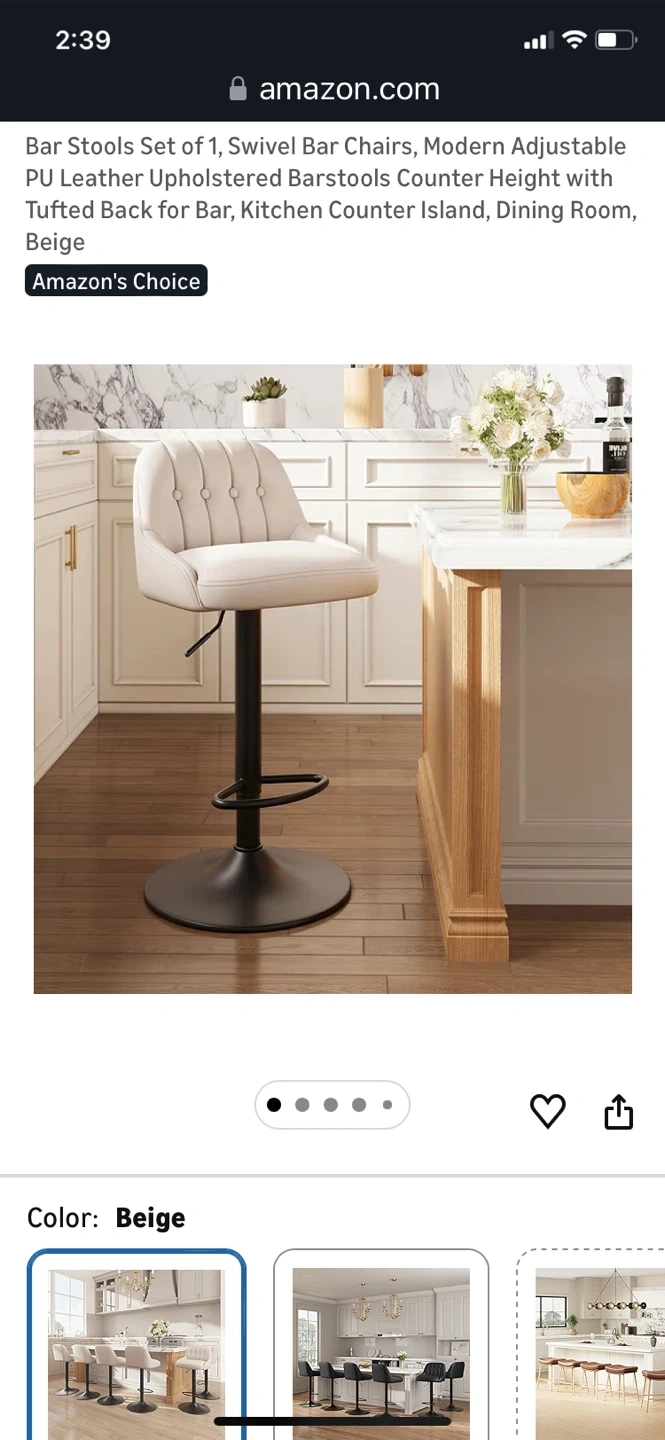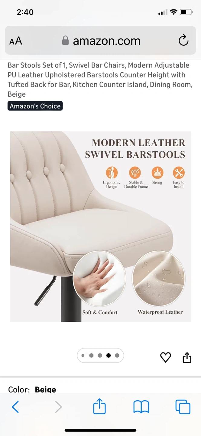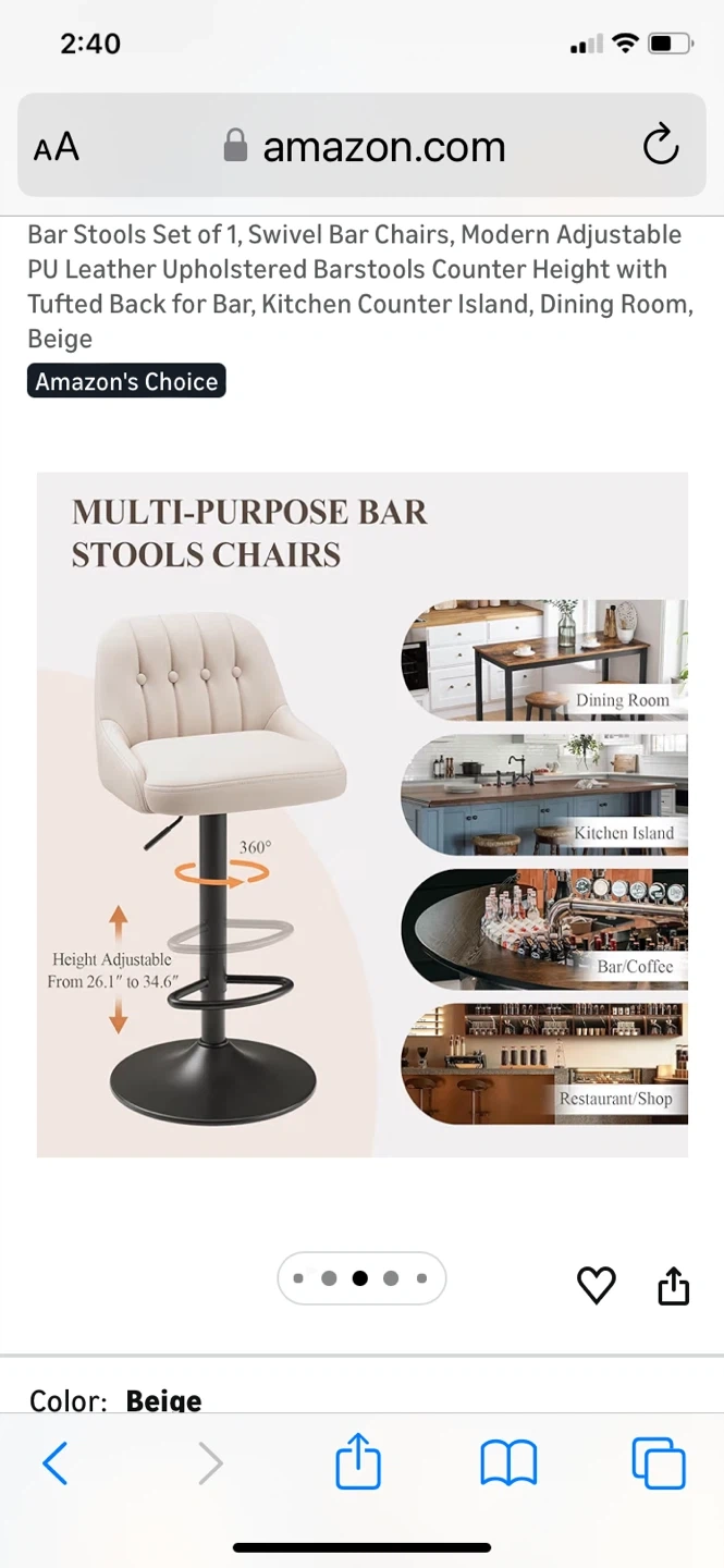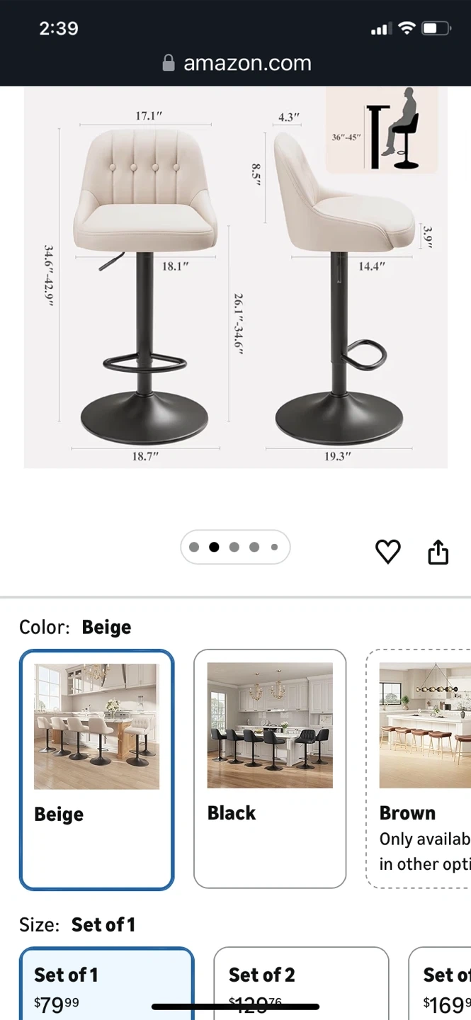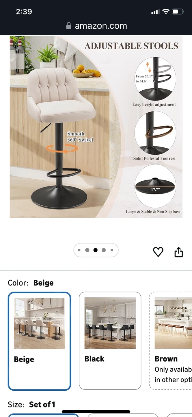 Modern adjustable bar stools with tufted back. Features smooth 360 swivel and a solid pedestal footrest. Height adjusts from 26.1" to 34.6" for versatile seating. "Amazon's Choice" item with high-density comfort sponge.bought for $79.99