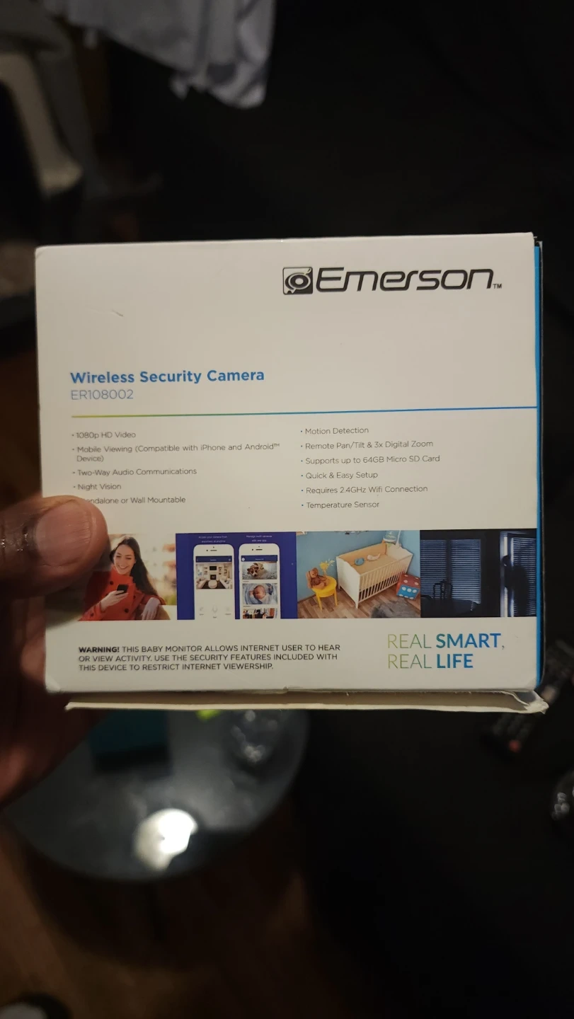 Emerson Wireless Security Camera ER108002. Features 1080p HD video and mobile viewing. Supports up to 64GB Micro SD card and includes motion detection. Requires 2.4GHz WiFi connection.