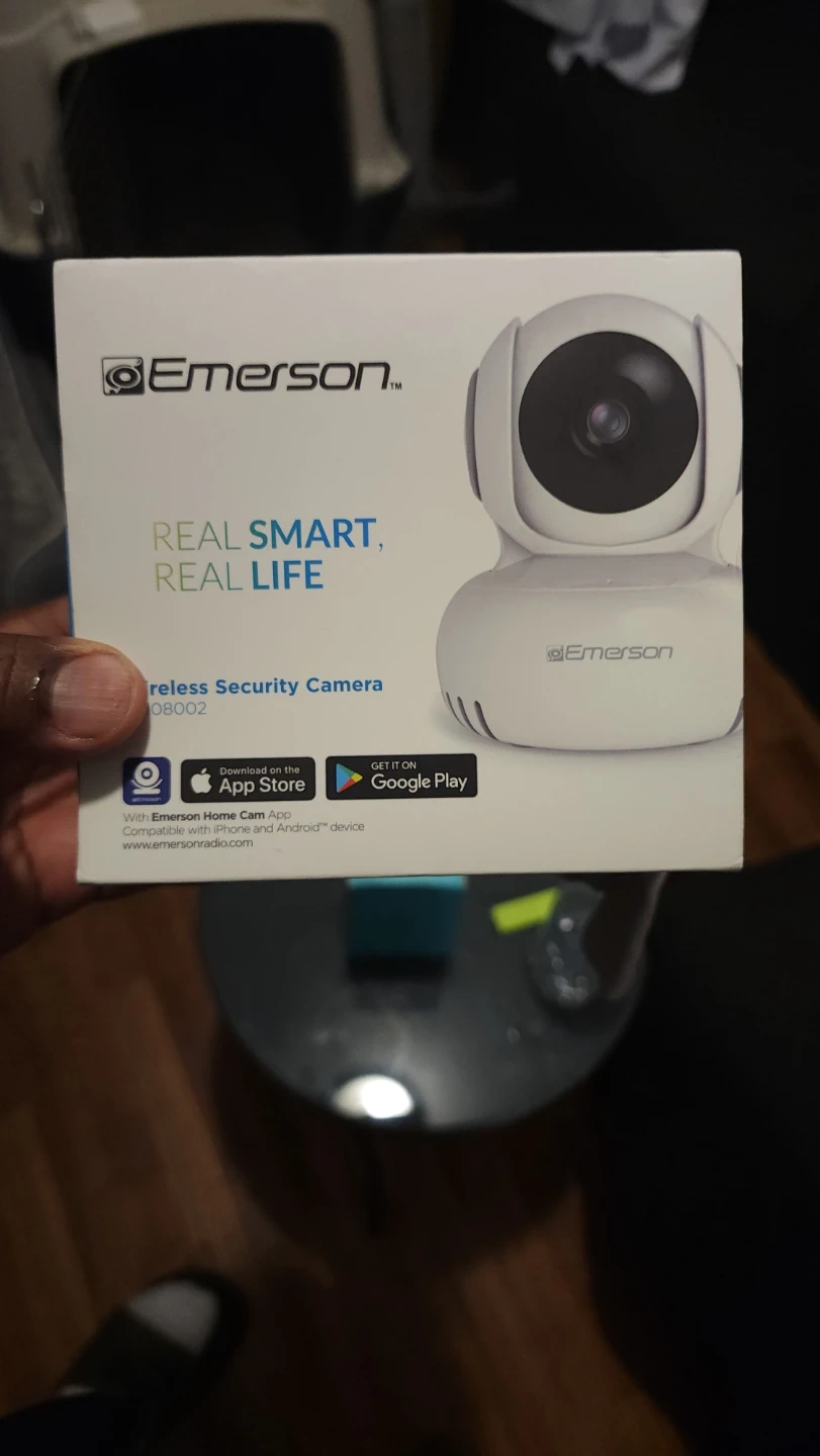 Emerson Wireless Security Camera ER108002. Features 1080p HD video and mobile viewing. Supports up to 64GB Micro SD card and includes motion detection. Requires 2.4GHz WiFi connection.