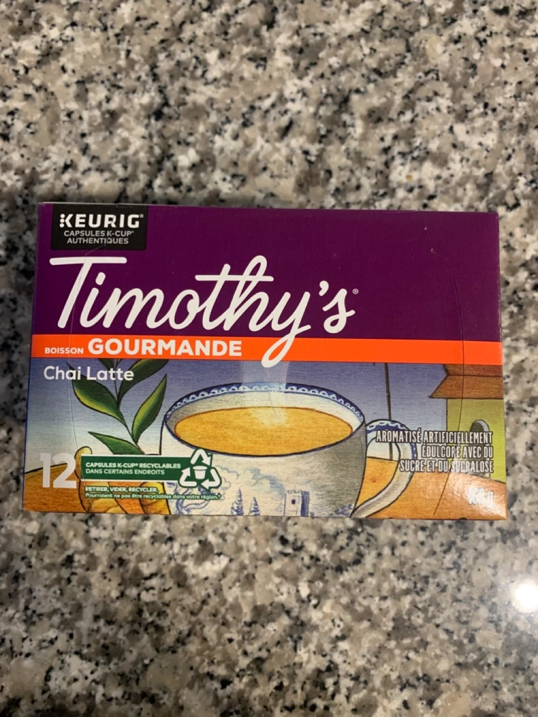 Enjoy Timothy's Gourmande Chai Latte K-Cup compatible pods.
