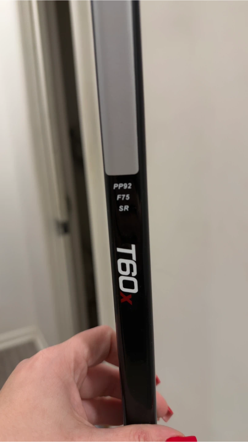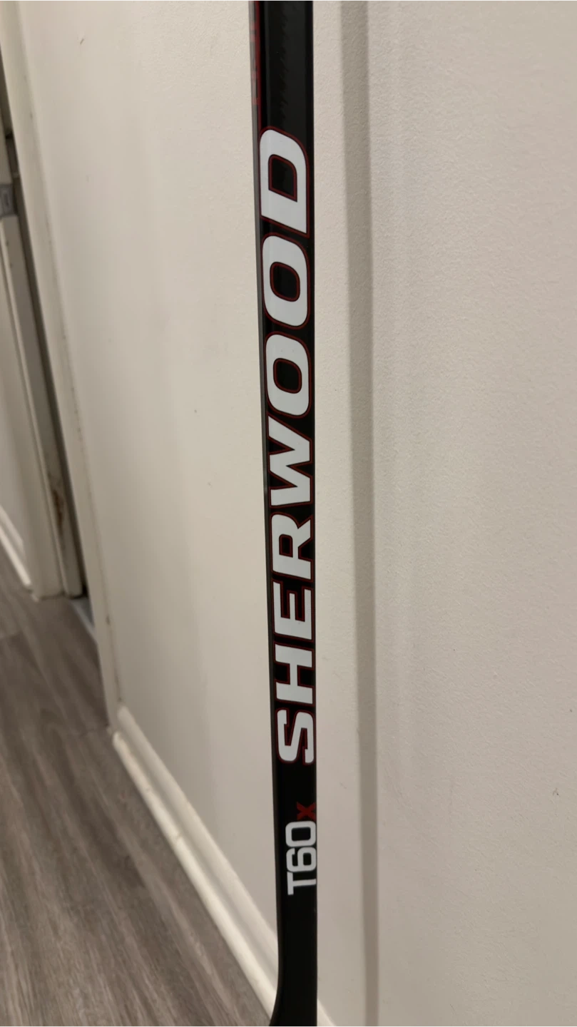 Sherwood T60X hockey stick for seniors. It's a senior size stick with a PP92 curve and F75 flex. This stick is ready for the rink!