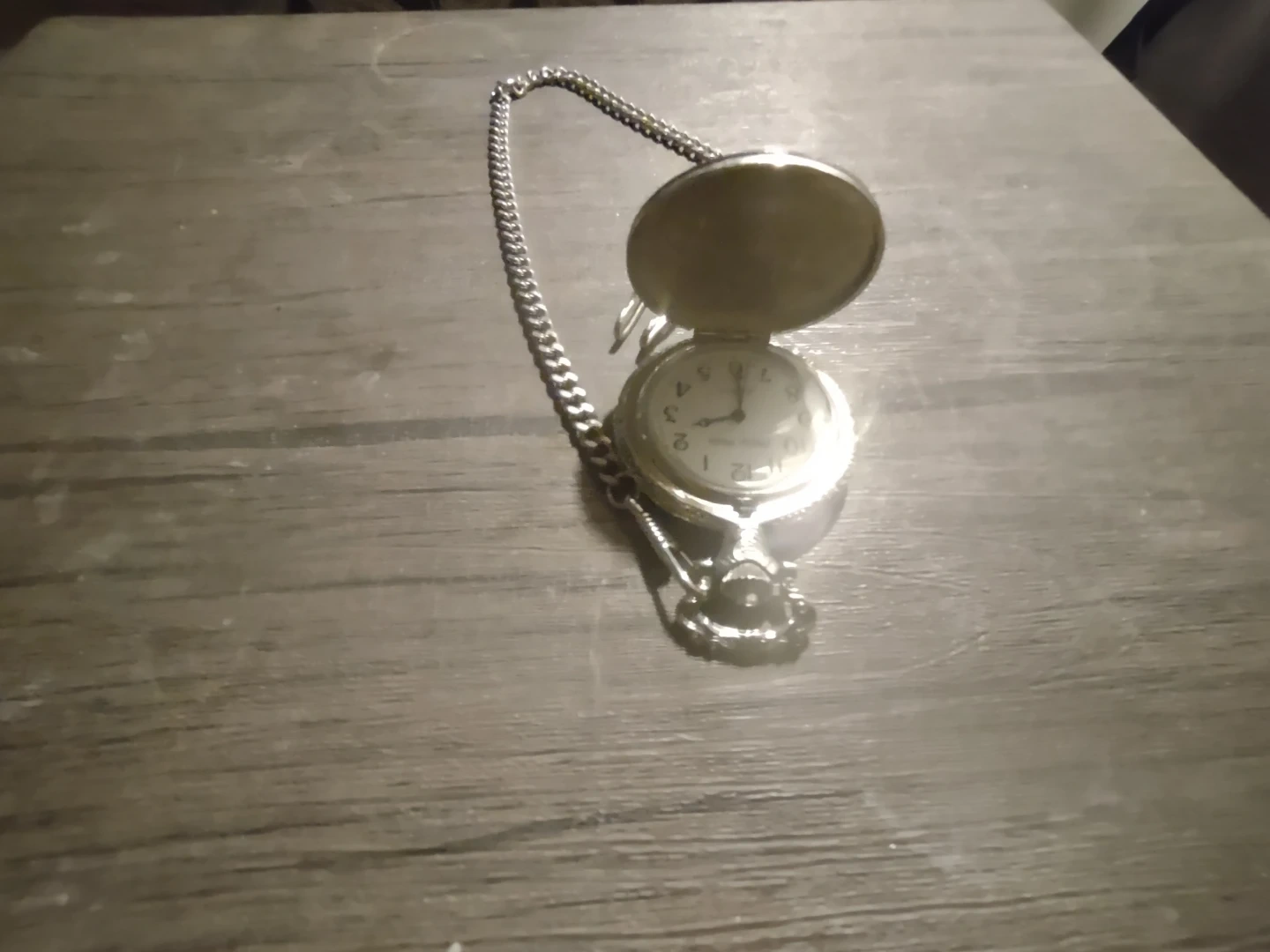 A classic silver-tone pocket watch with a matching chain. It opens to reveal a white face with black hour markers and hands. This watch comes with a clip for easy attachment. Perfect for someone who appreciates vintage style!