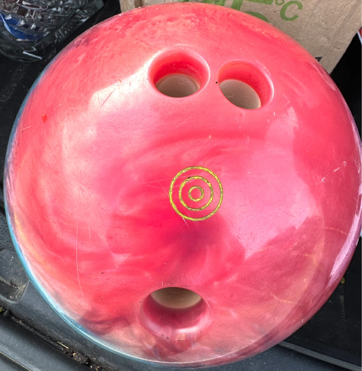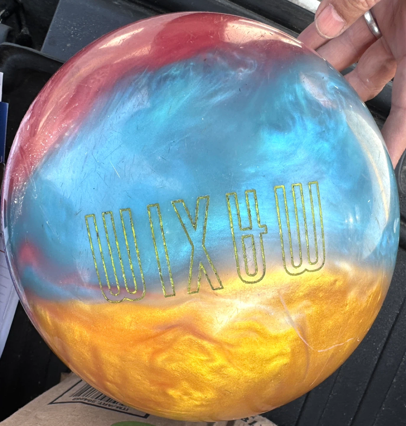 This is an Ebonite bowling ball with a vibrant swirled red, blue, and gold finish. It's made in the U.S.A. and features the "WIX H W" model name. It has three finger holes for grip.