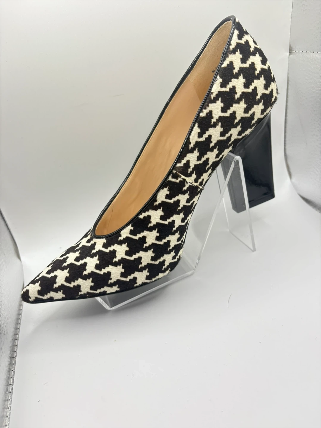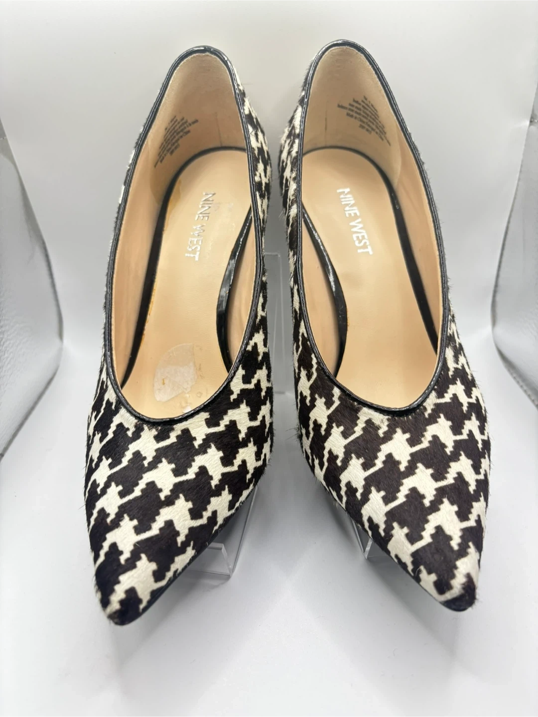 These Nine West heels feature a classic houndstooth pattern in black and white. They have a pointed toe and a block heel. Material appears to be a textured fabric with faux leather trim.