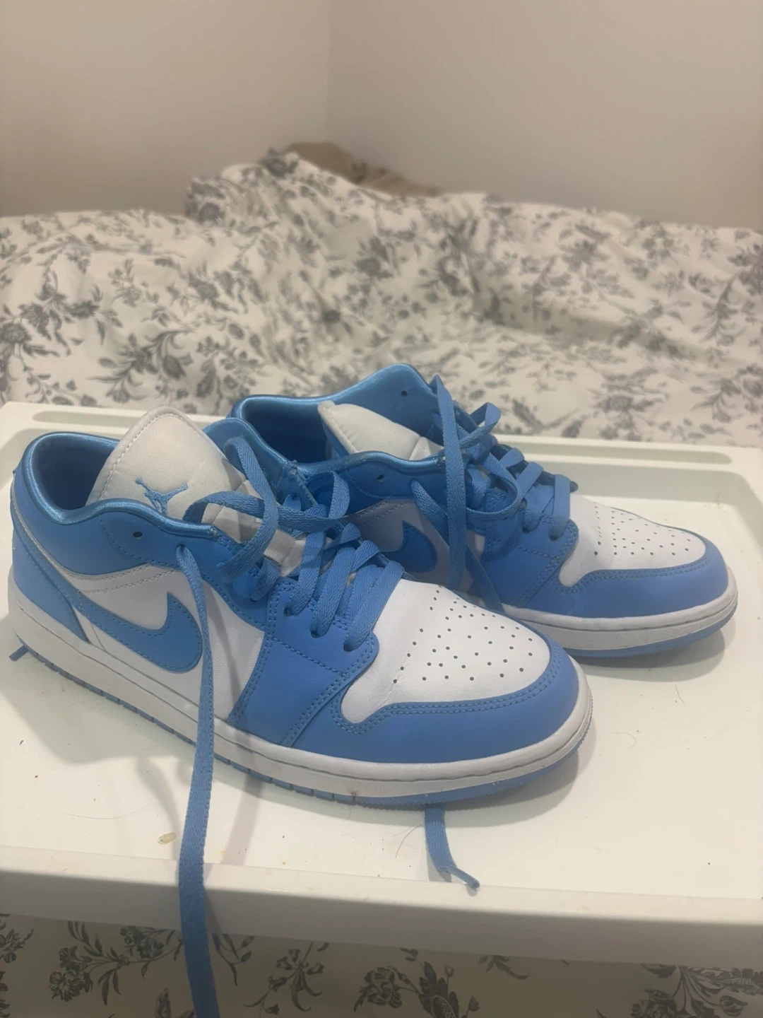 Classic Air Jordan 1 Low sneakers in a UNC-inspired blue and white colourway. These kicks are low-top with a white perforated toe box and blue overlays. It's a stylish pair for everyday wear!