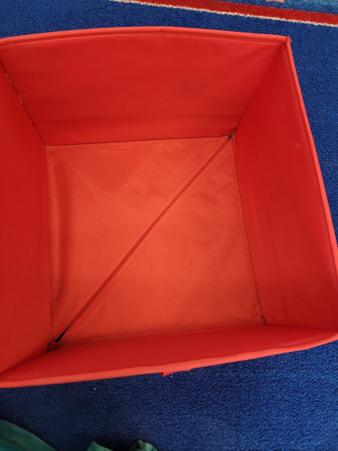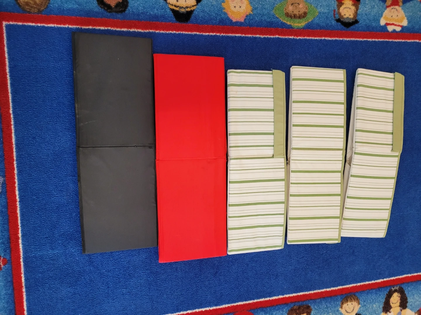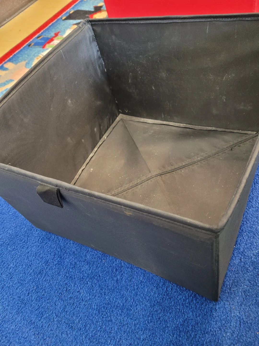 These are two fabric storage bins, one black and one red. They're great for organizing toys, books, or other household items. Collapsible design makes them easy to store when not in use.