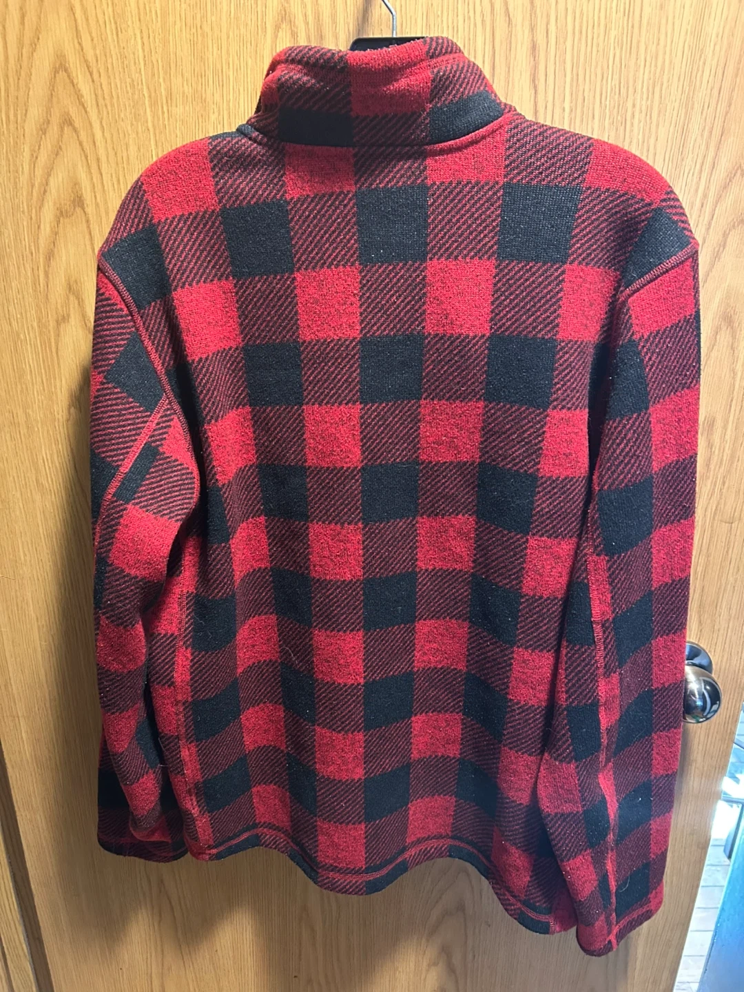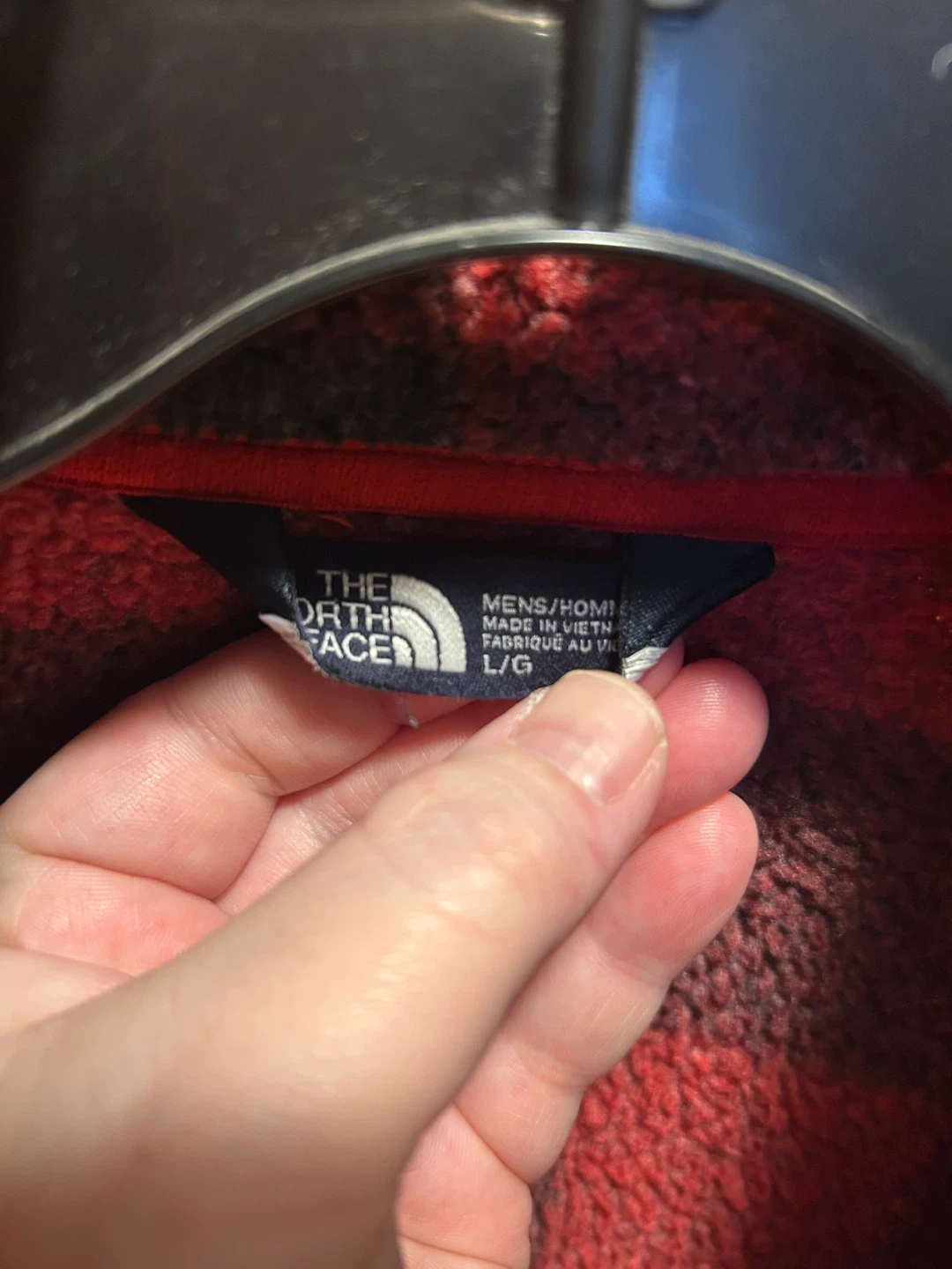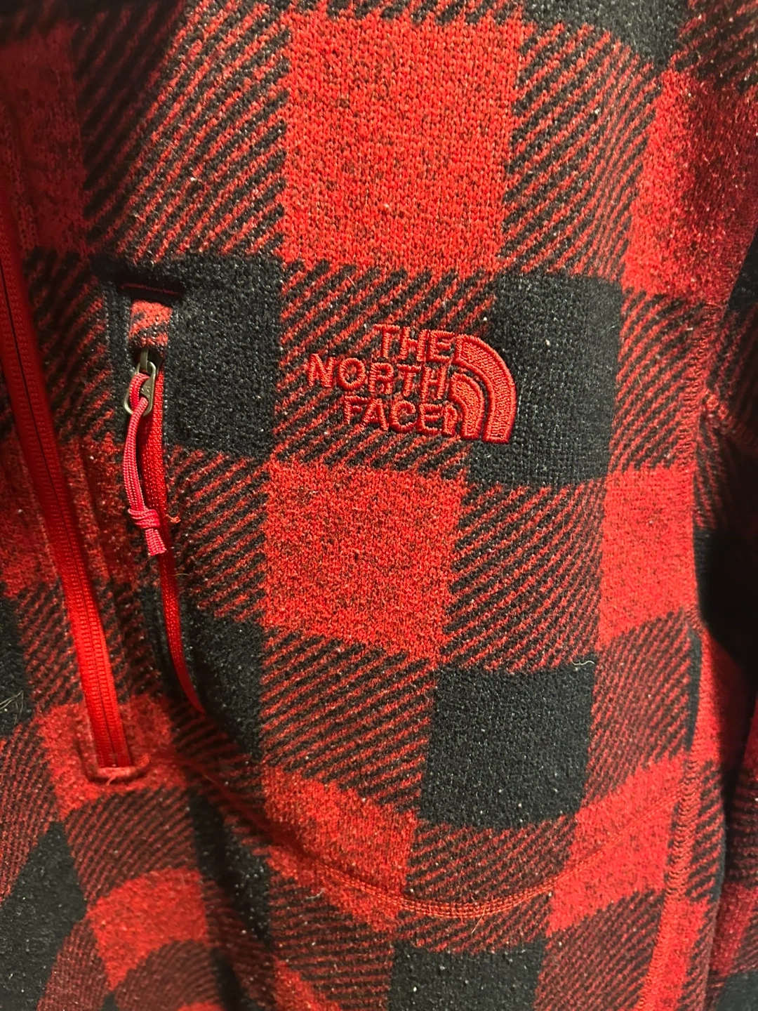 The North Face fleece pullover in red and black plaid. Men's/hommes size L/G. It's made of soft fleece material and features a 1/4 zip closure with a zippered pocket. This pullover is great for staying warm outdoors!