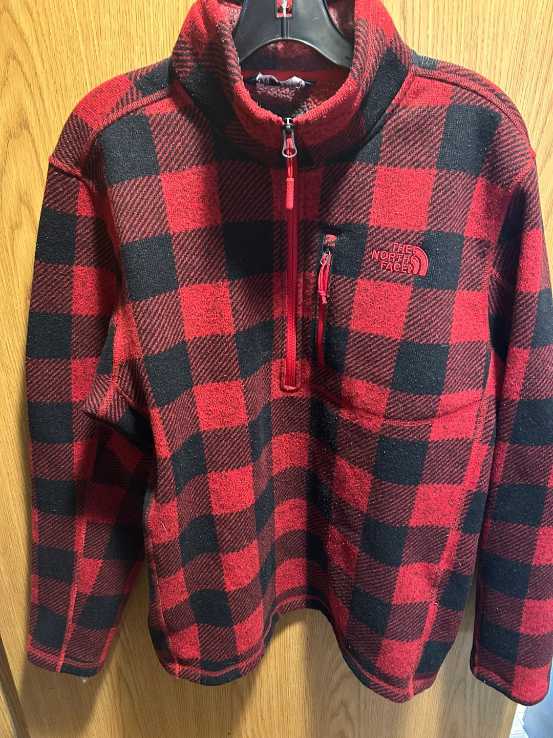 The North Face fleece pullover in red and black plaid. Men's/hommes size L/G. It's made of soft fleece material and features a 1/4 zip closure with a zippered pocket. This pullover is great for staying warm outdoors!