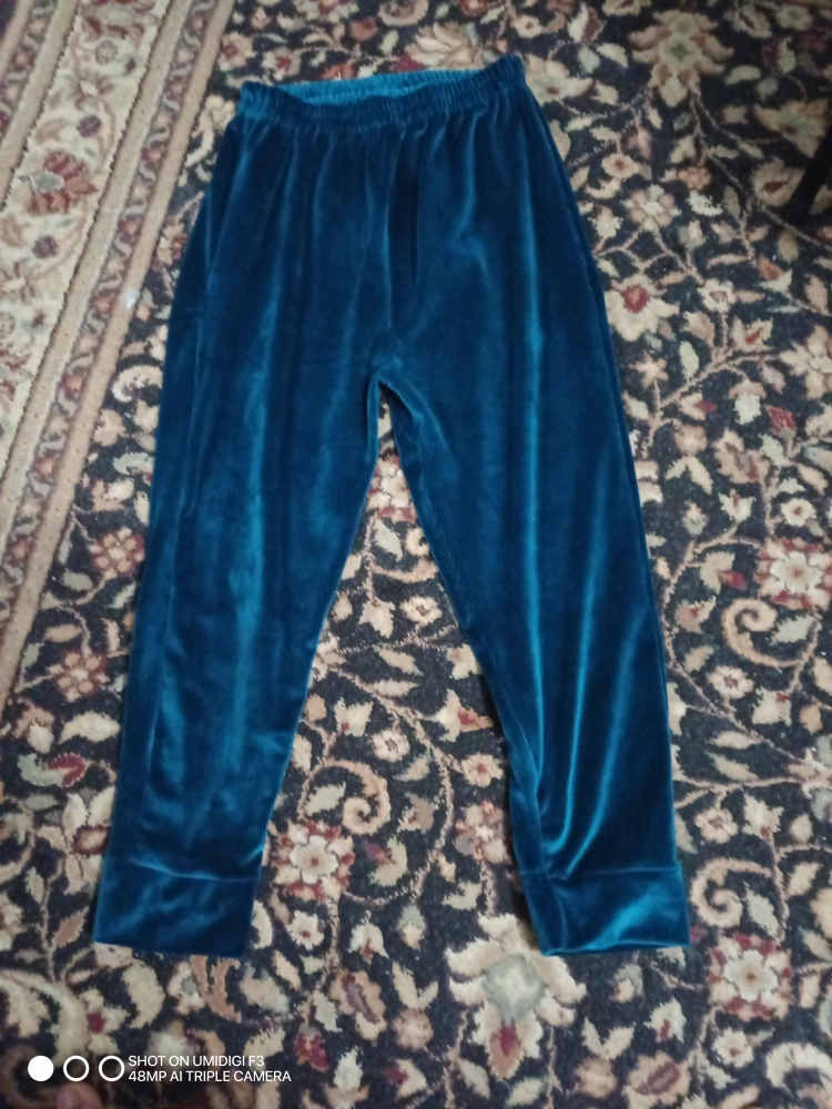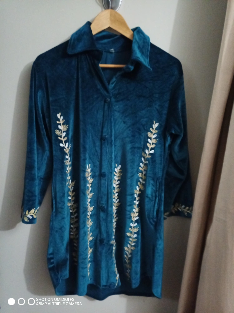 Gorgeous teal velvet loungewear set with Includes a button-up shirt with embroidered detail and matching pants. Soft and comfortable material, perfect for relaxing at home. $45.00 final price.