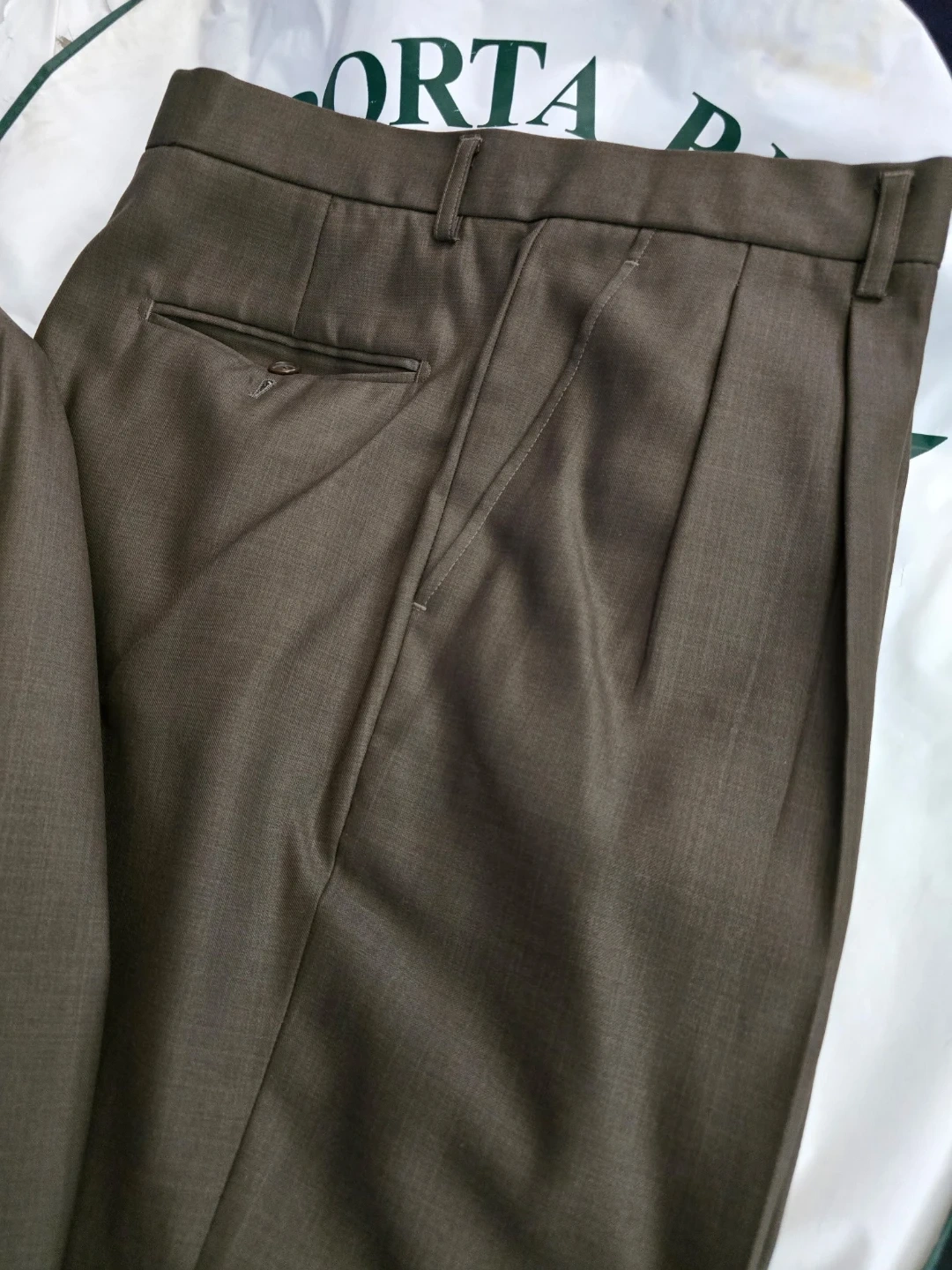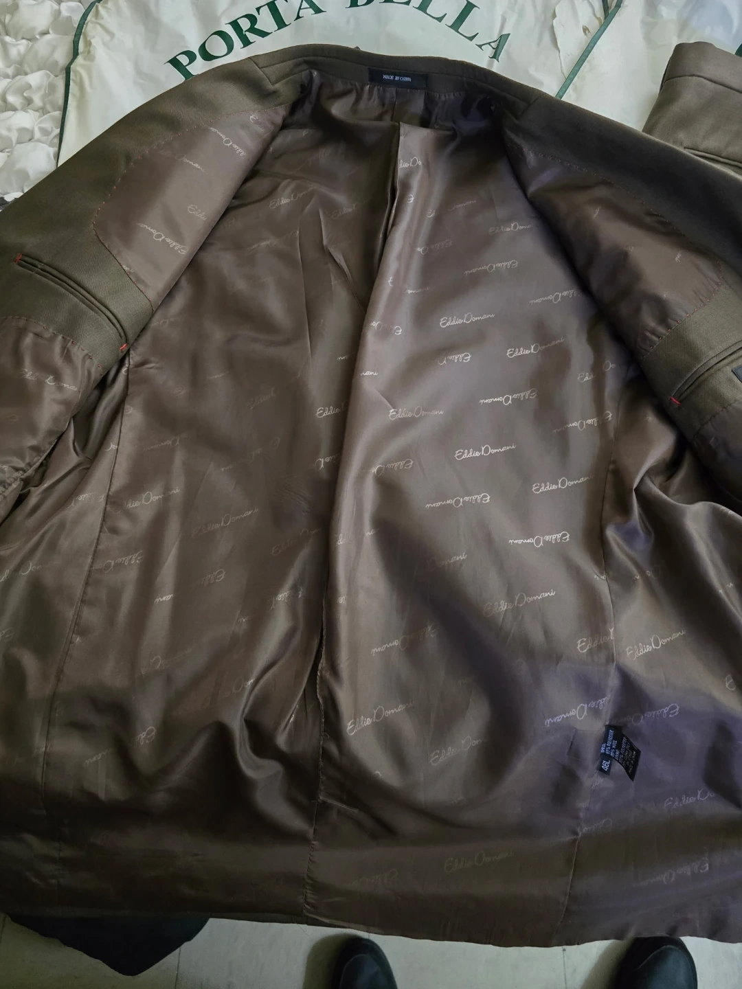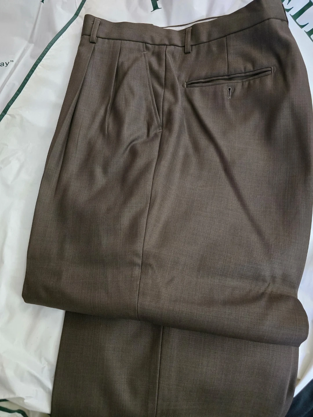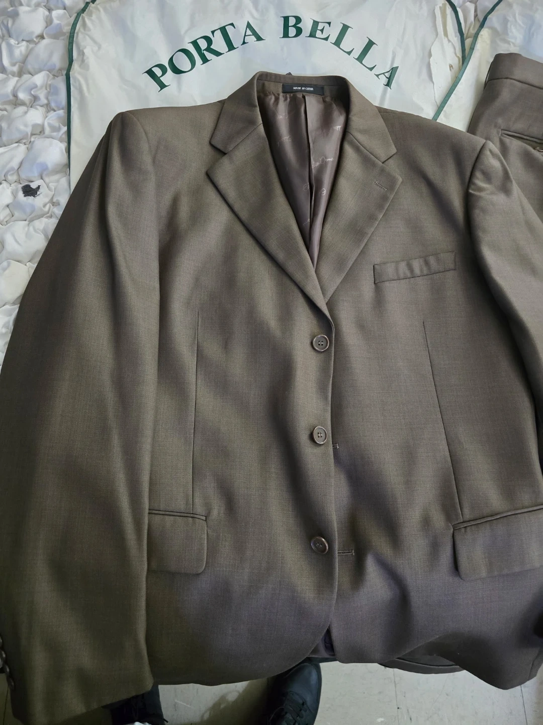 Selling a Porta Bella men's suit in good condition. It includes both the jacket and pants. The color is a neutral brown/gray. Perfect for business or formal occasions!