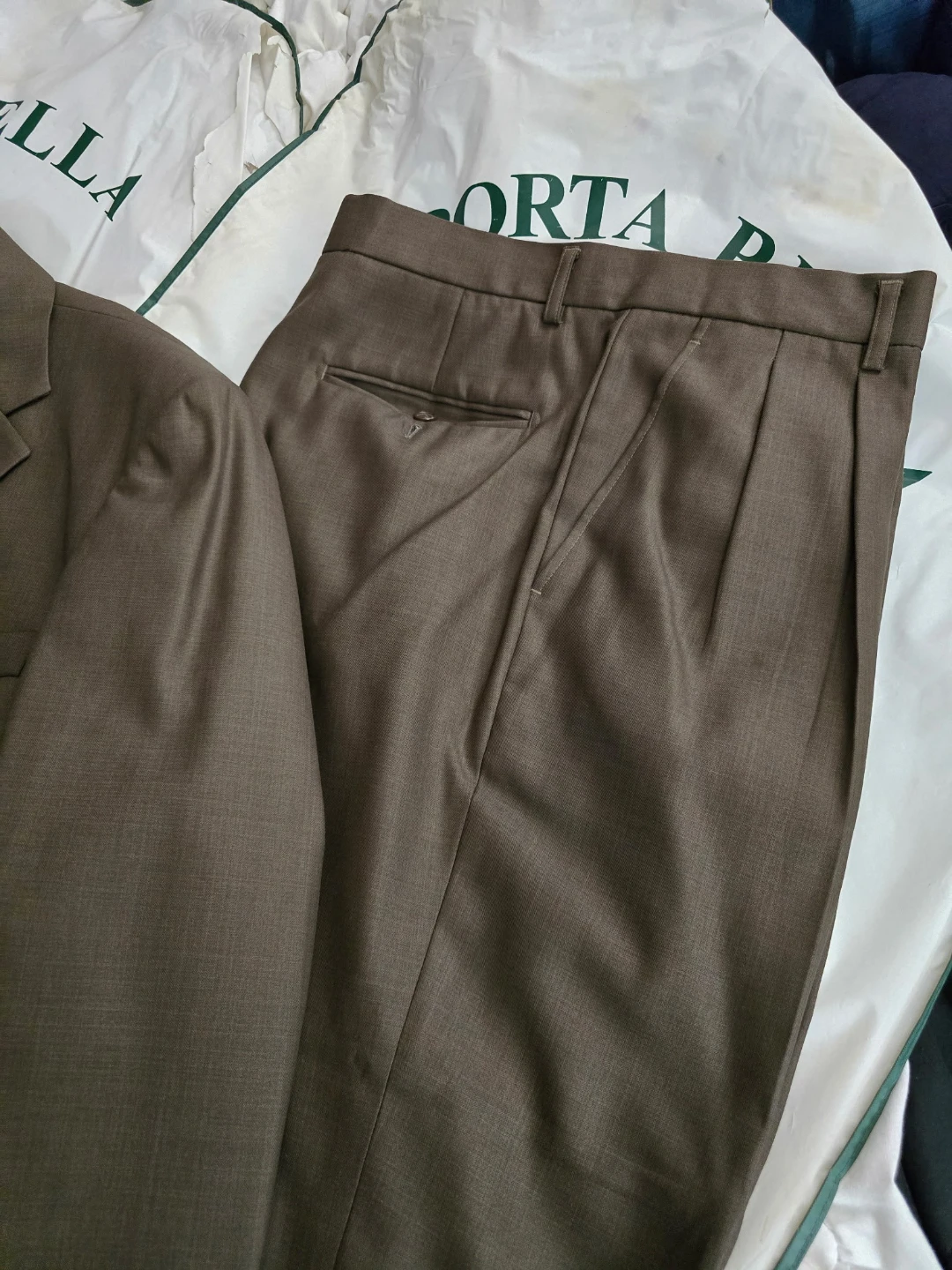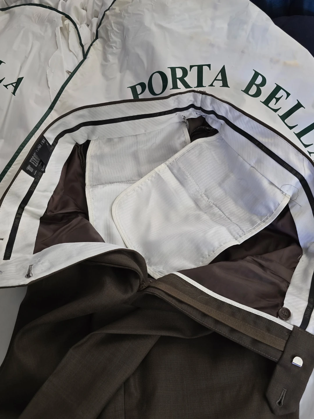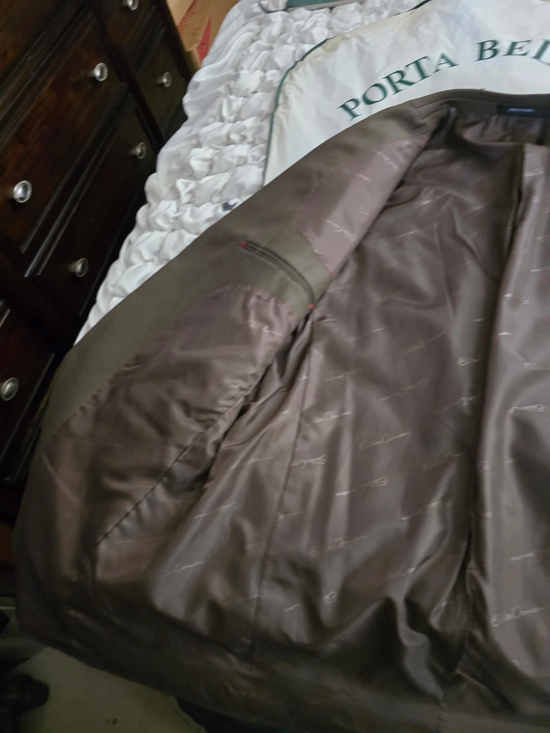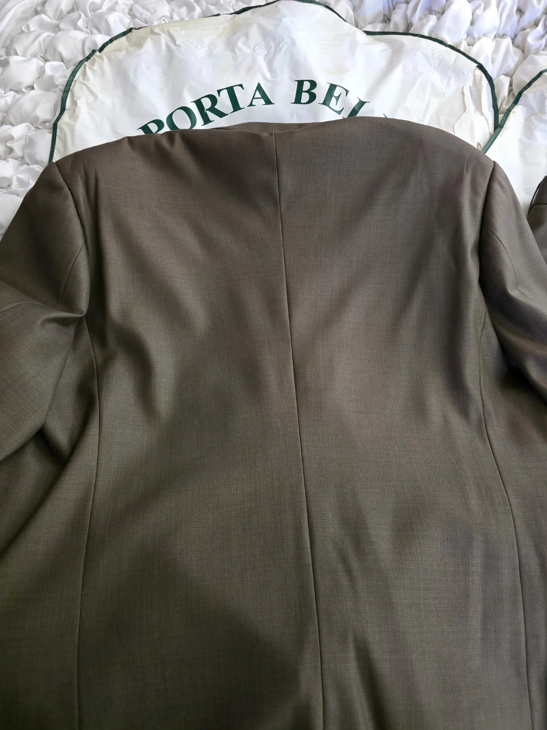 Selling a Porta Bella men's suit in good condition. It includes both the jacket and pants. The color is a neutral brown/gray. Perfect for business or formal occasions!