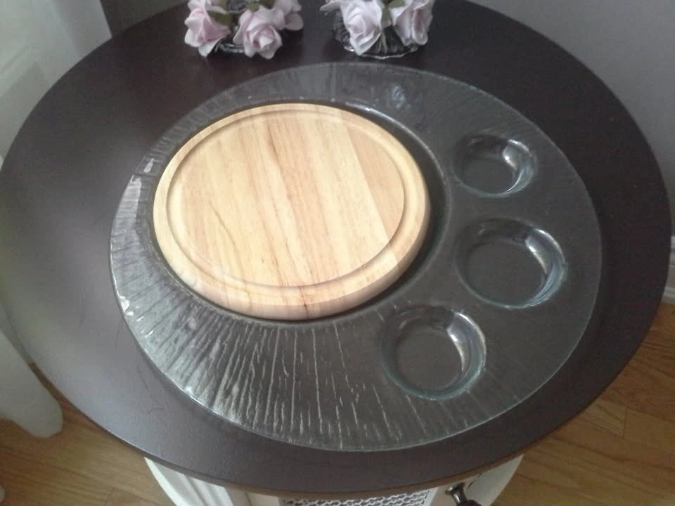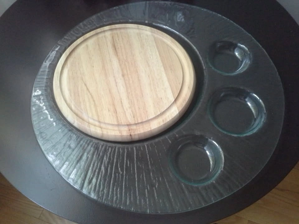 Wooden & glass appetizer cheese platter. Measurements: 15.5" (wooden plate 9"). PU: Winston Churchill Blvd & Burnhamthorpe Rd W, Mississauga.