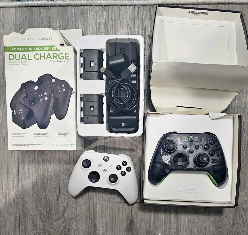 2 Xbox controlellers with rechargeable batteries and charging station for sale