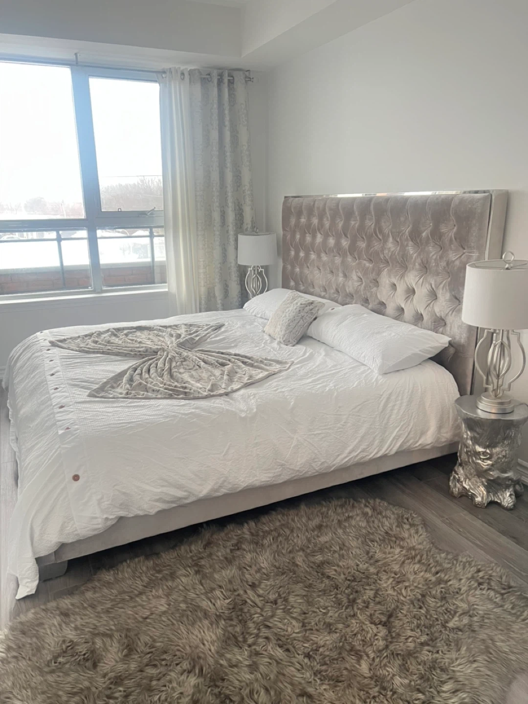 This bed frame features a plush velvet tufted headboard with crystal-like accents. It offers a sturdy and stylish foundation for your mattress. The frame is designed for durability and comes in a neutral grey colour.