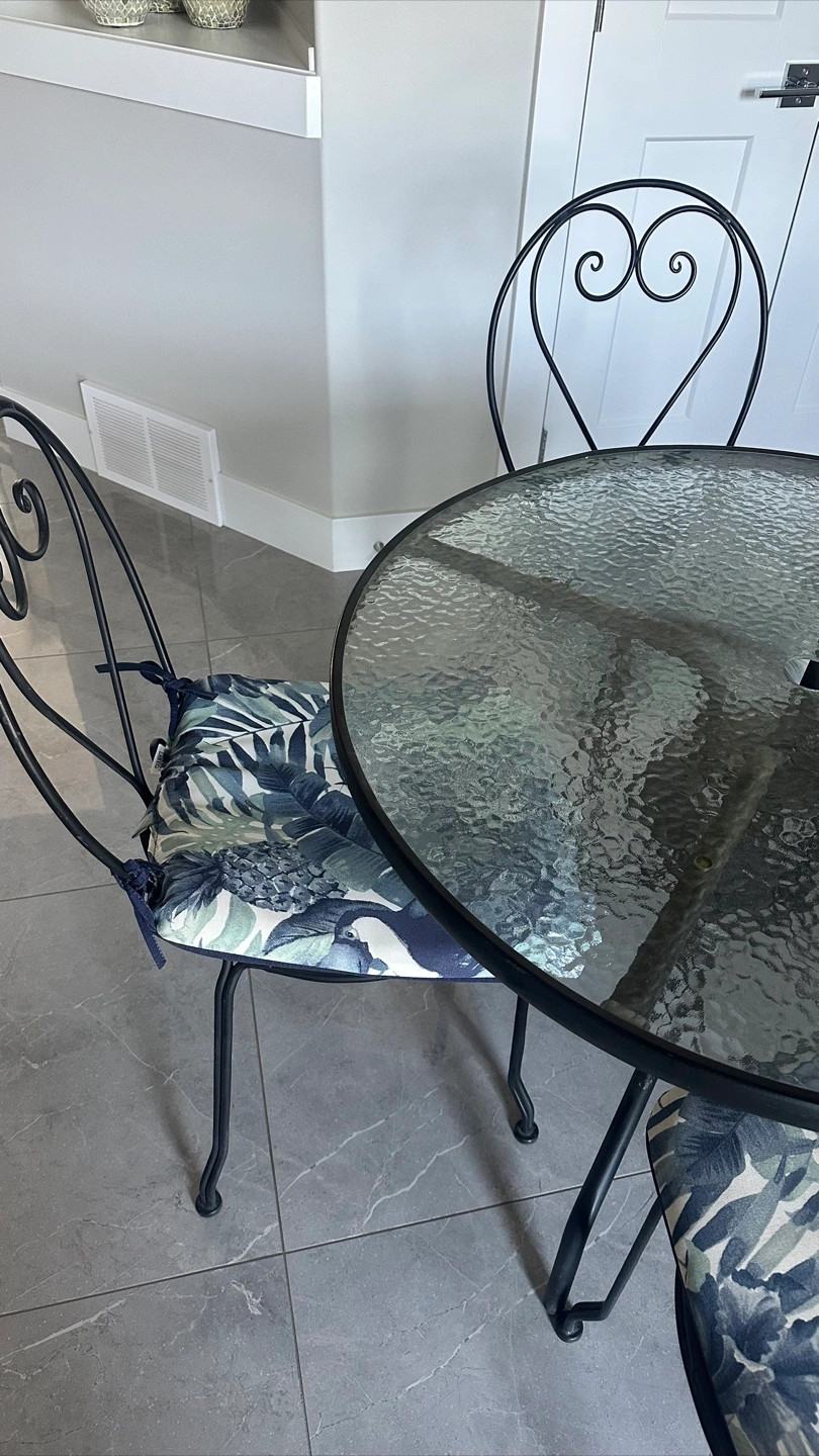 Round table with glass top. Set includes four chairs. Chairs have floral cushions. Perfect for enjoying a quiet morning coffee.