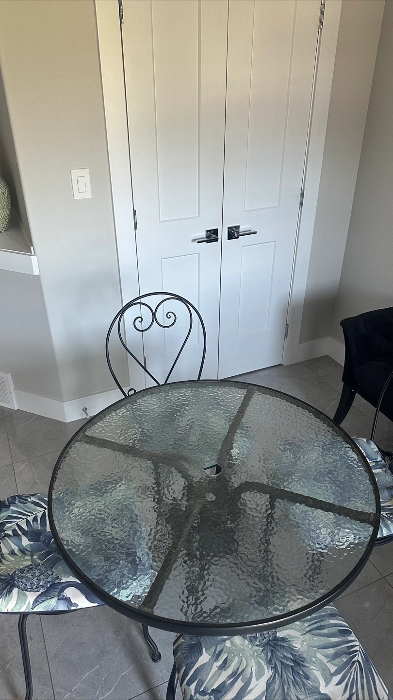 Round table with glass top. Set includes four chairs. Chairs have floral cushions. Perfect for enjoying a quiet morning coffee.