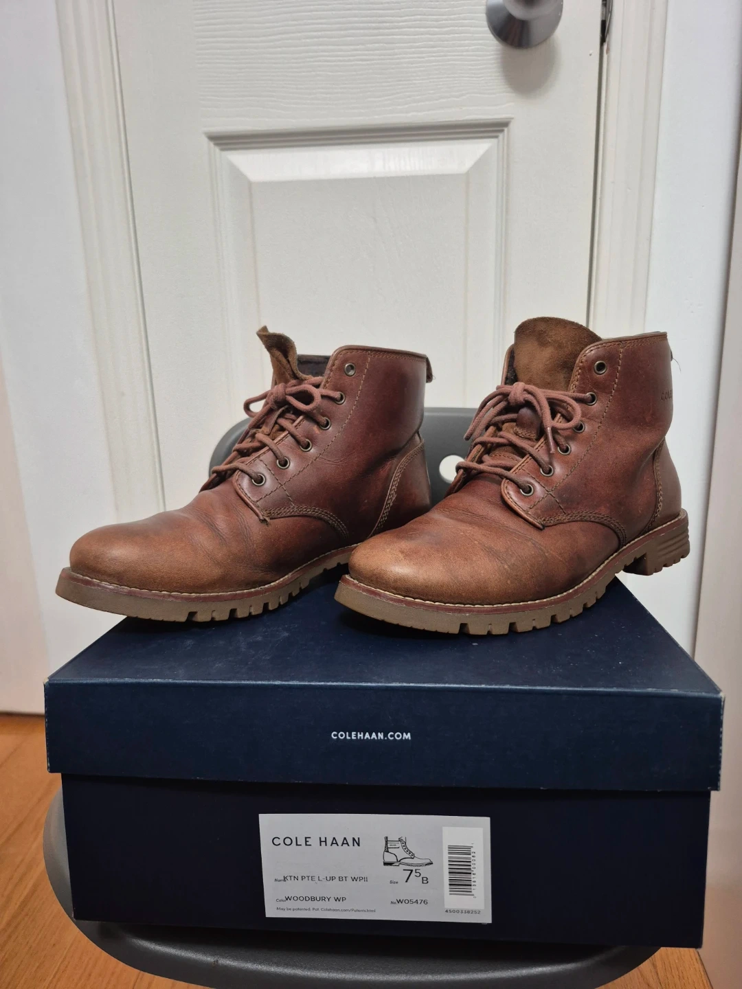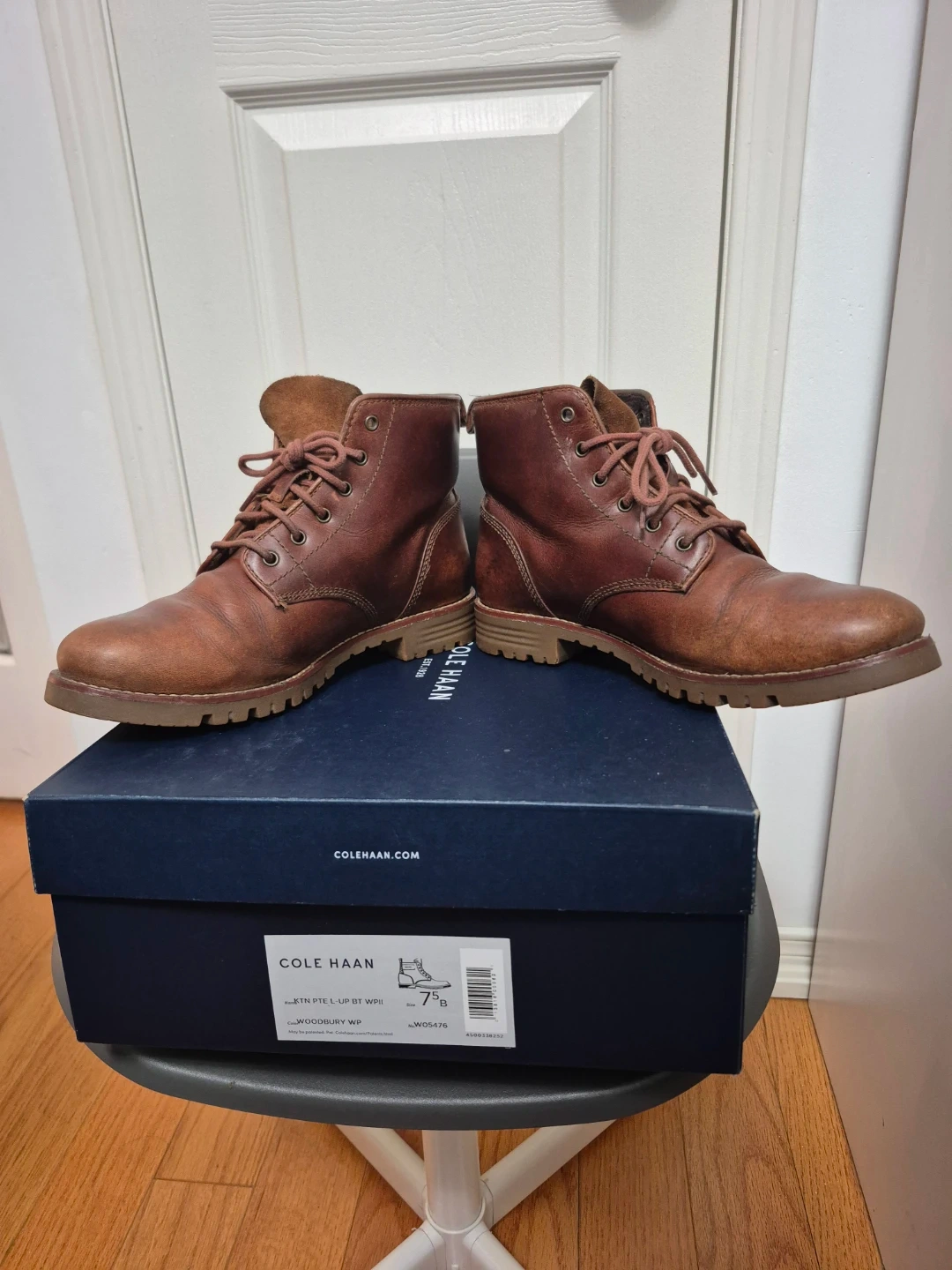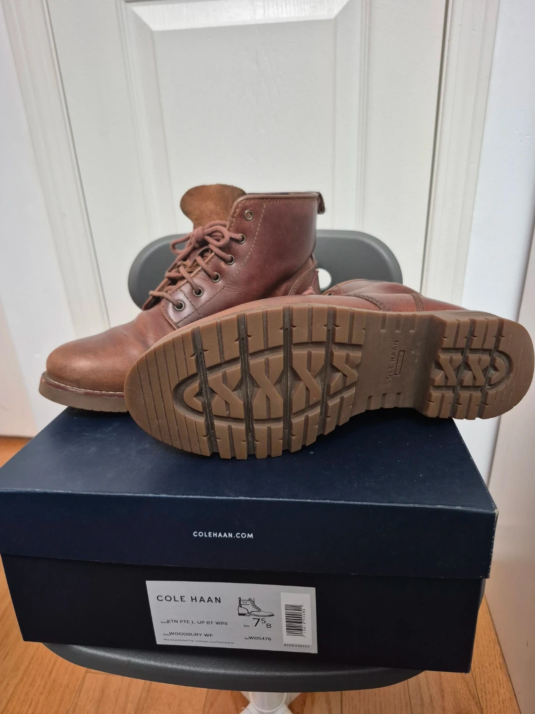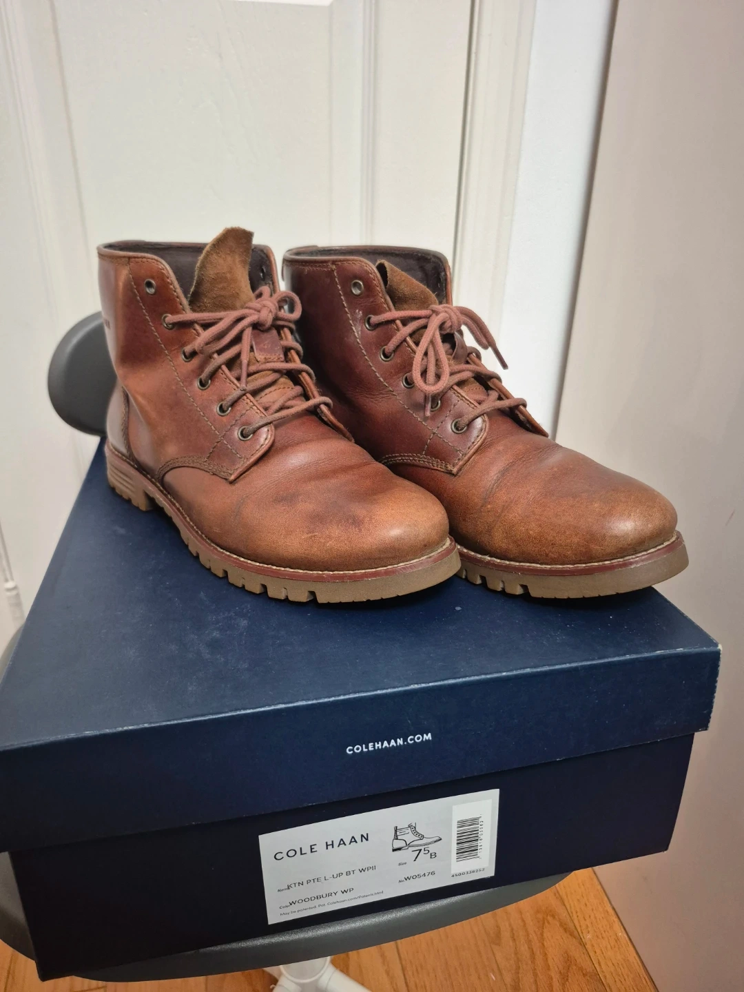 Cole Haan brown leather lace-up boots with a durable sole. Includes the original box. These boots are size 7.5 B. They're great for everyday wear or light outdoor activities.