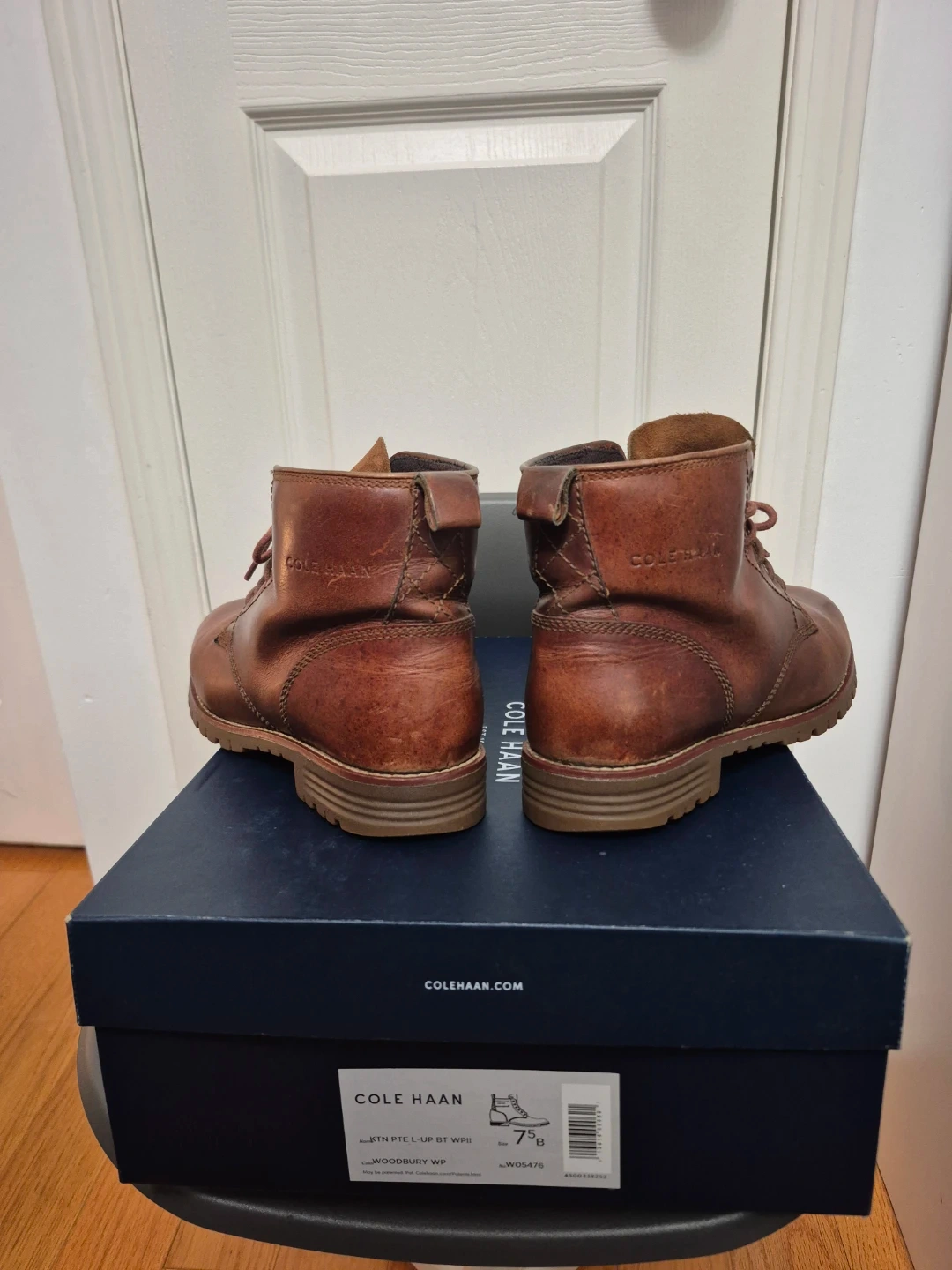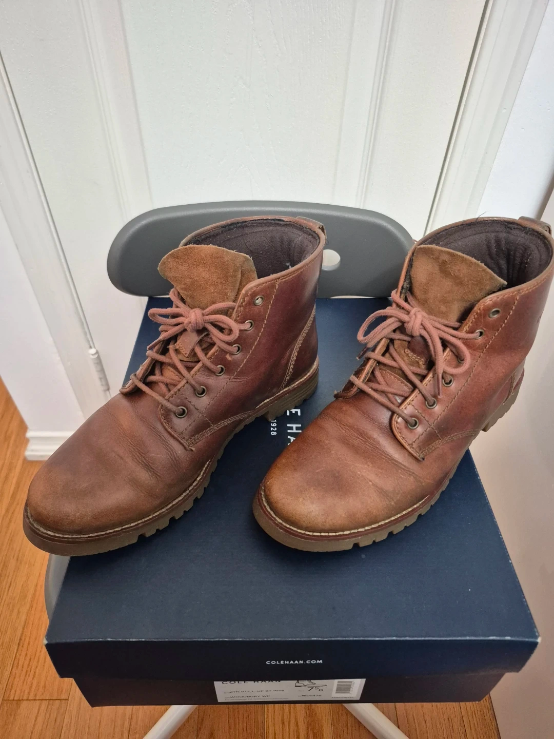Cole Haan brown leather lace-up boots with a durable sole. Includes the original box. These boots are size 7.5 B. They're great for everyday wear or light outdoor activities.