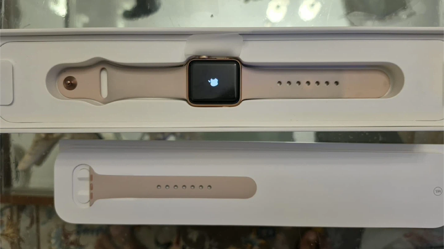 Apple Watch Series 3 in rose gold aluminum case with a pink sand sport band. Includes original box, charging cable, and magnetic charging puck. 38mm GPS + cellular