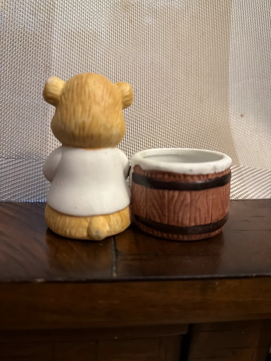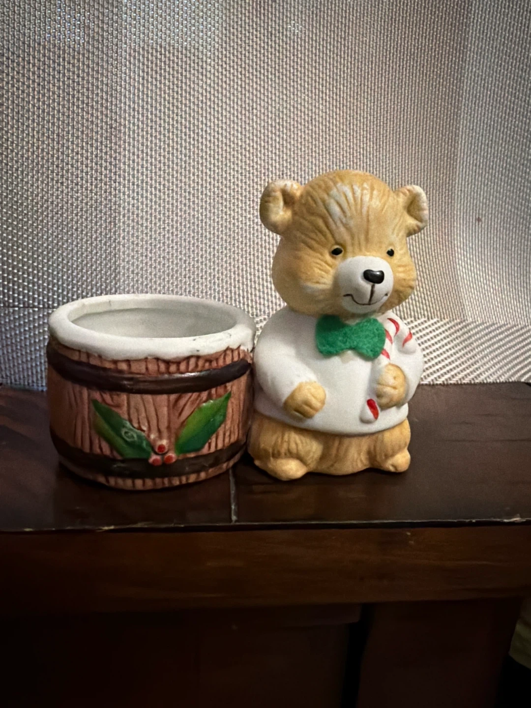 Cute ceramic bear holding a candy cane, next to a decorative barrel planter. The barrel has a festive holly design. It's perfect for small plants or as a charming desk accessory.