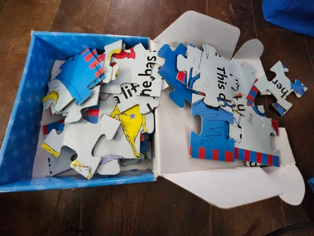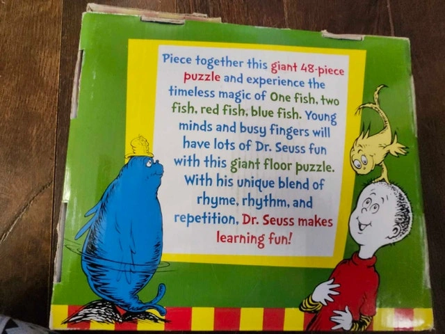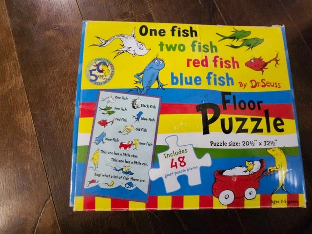 Get ready for some Dr. Seuss fun with this gently used One Fish, Two Fish, Red Fish, Blue Fish floor puzzle! This giant 48-piece puzzle is perfect for young minds and busy fingers. Specifications: Brand: Dr. Seuss, Puzzle Size: 20½" x 32½", Includes 48 giant puzzle pieces, Ages 3-5 years. With its vibrant colours and beloved characters, this puzzle will bring hours of entertainment to your little ones. Cash accepted.