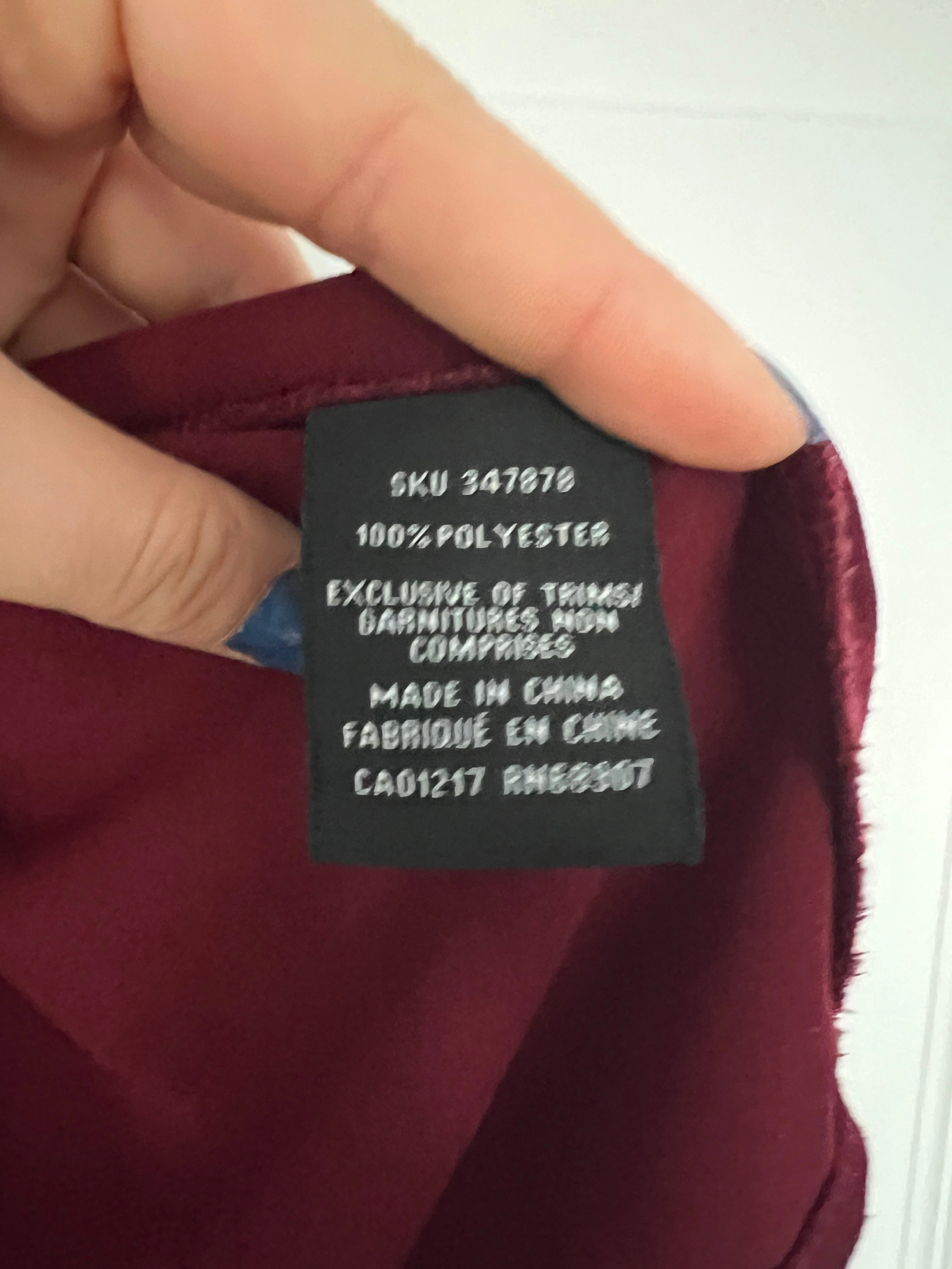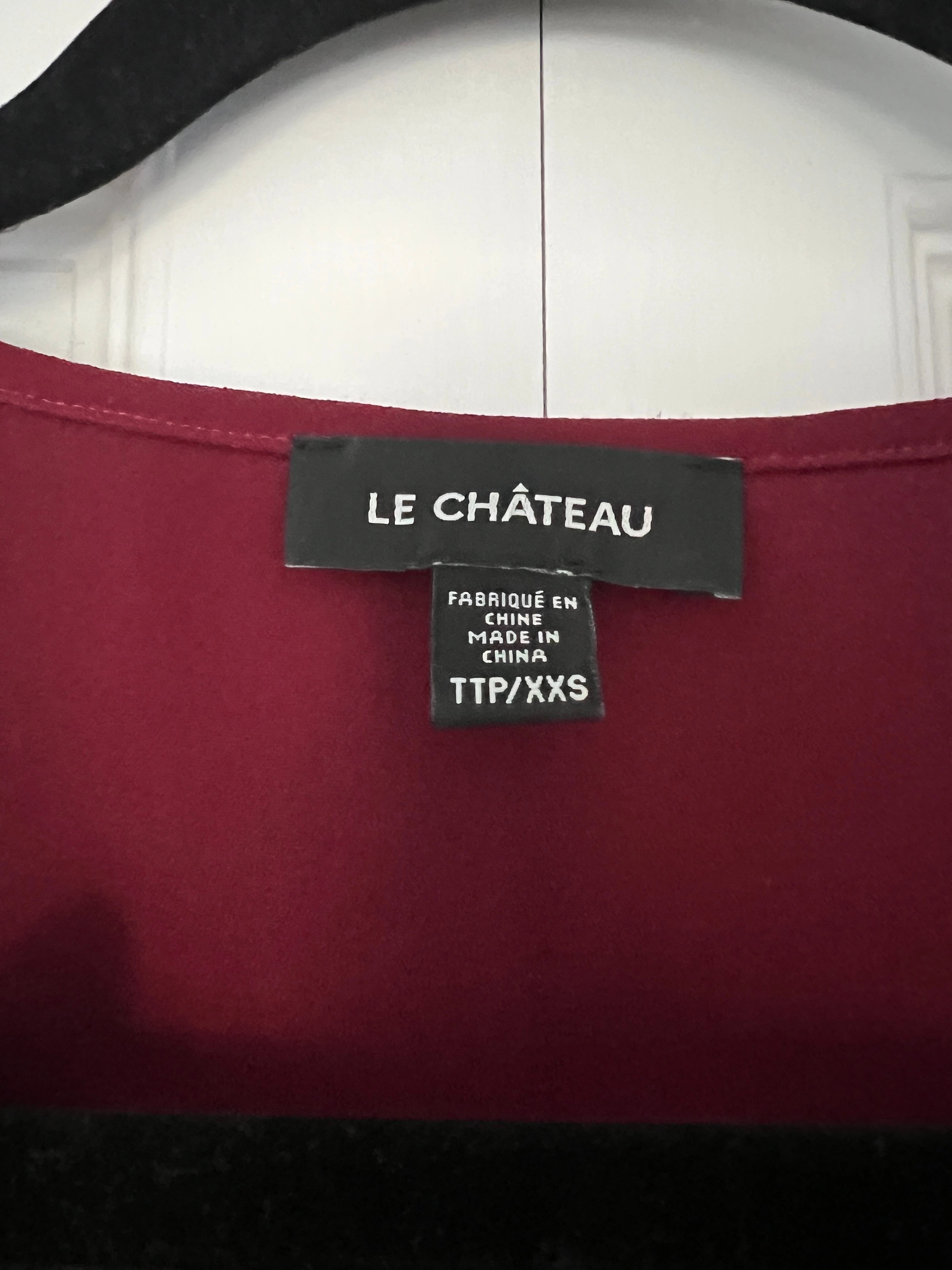 Selling a Le Chateau sleeveless blouse in a beautiful burgundy colour! It's made of 100% polyester and is a size XXS (but fits like XS).