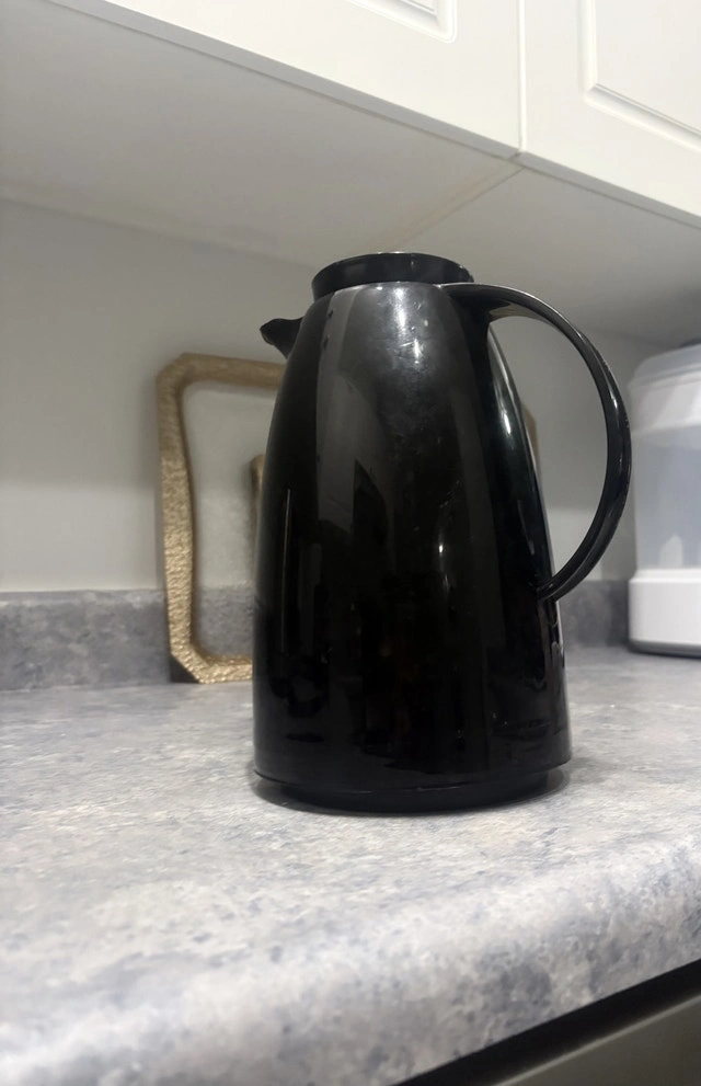 Keep your beverages hot or cold with this used Thermos. The black, sleek design will fit into any decor. Perfect for camping, picnics, or everyday use. Features: - Durable construction - Keeps liquids hot or cold for hours - Easy to pour