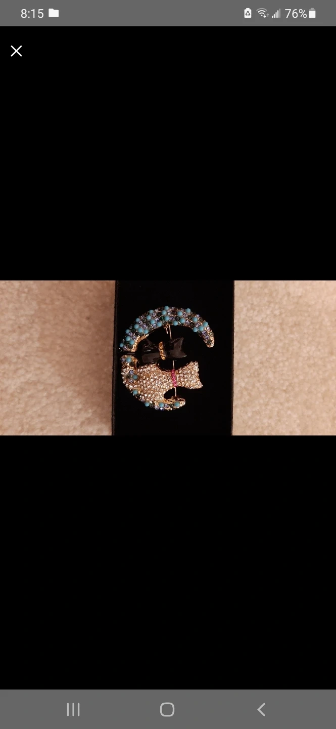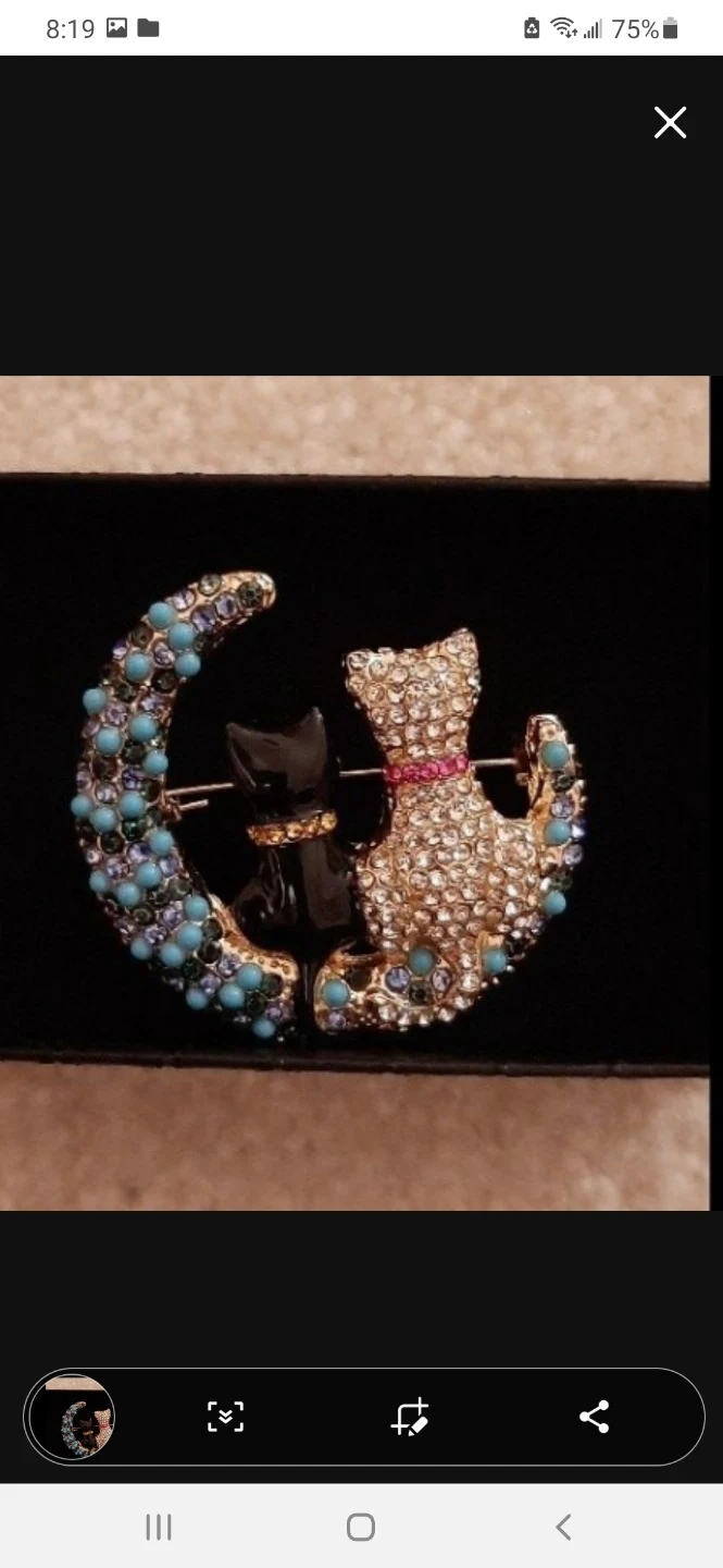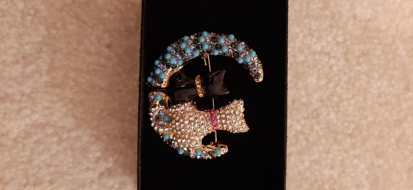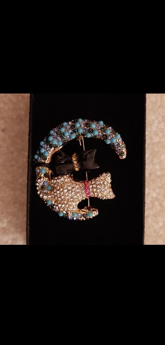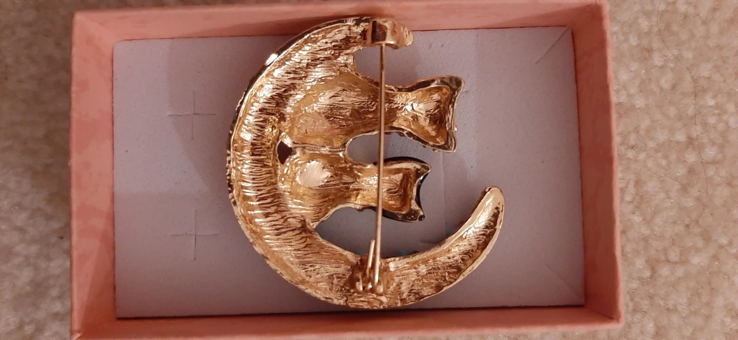 Adorable brooch featuring two cats sitting on a crescent moon. It's adorned with sparkling rhinestones and blue enamel beads. This piece adds a whimsical touch to any outfit!