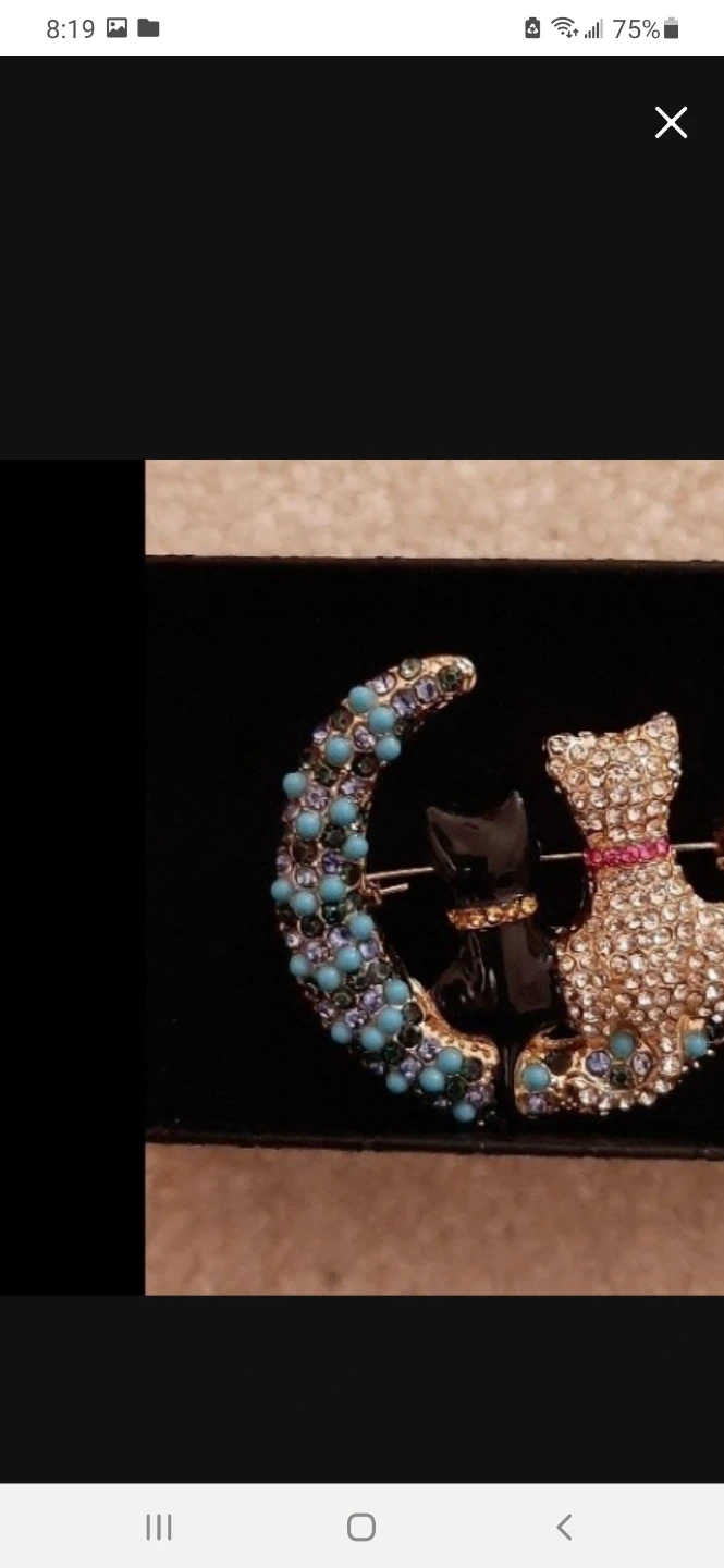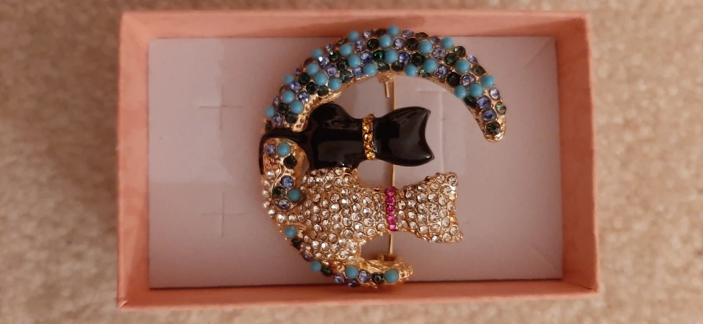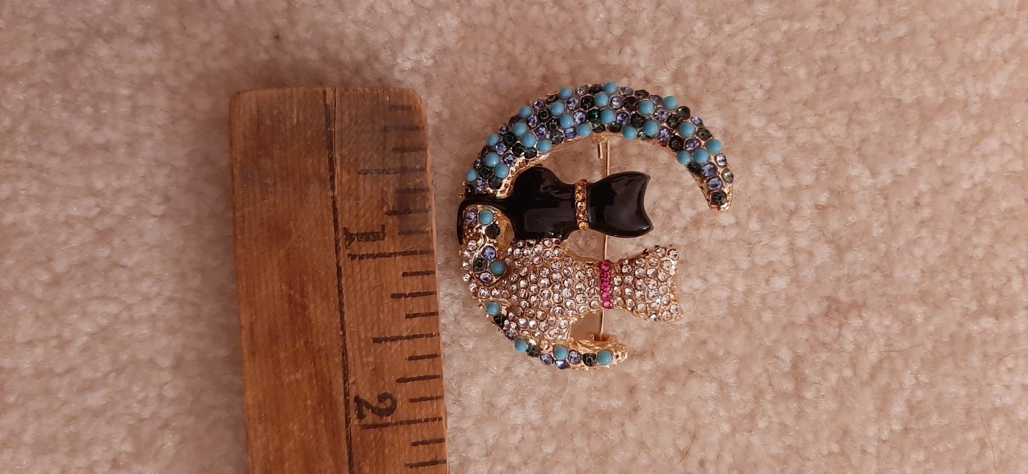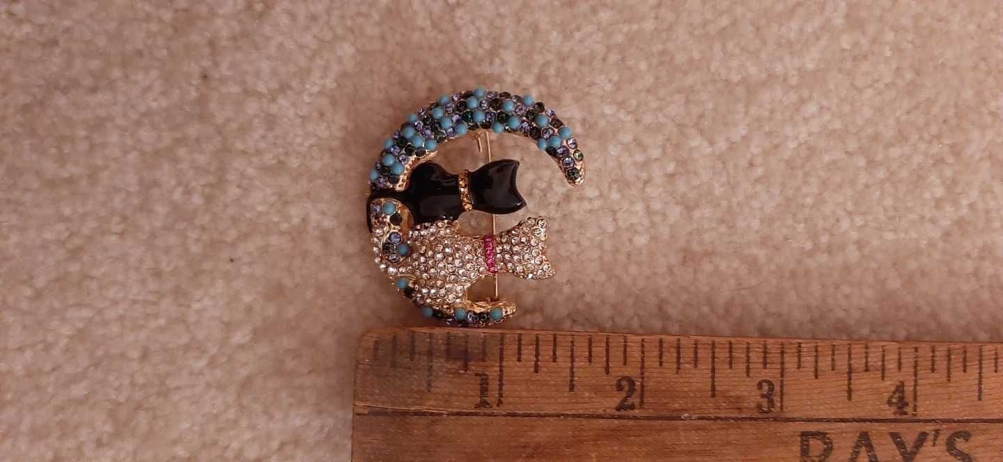 Adorable brooch featuring two cats sitting on a crescent moon. It's adorned with sparkling rhinestones and blue enamel beads. This piece adds a whimsical touch to any outfit!