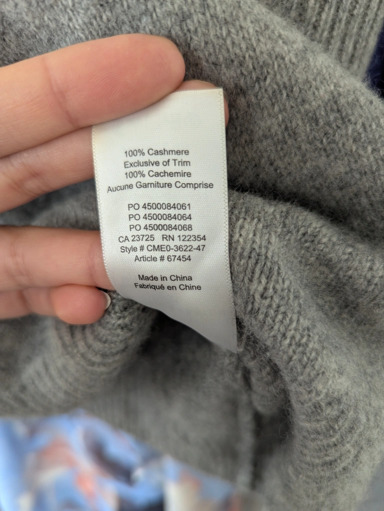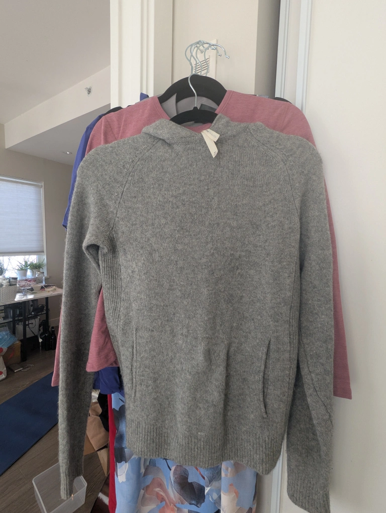 Grey cashmere hooded sweater. Size extra small, but would fit a small as well. 100% cashmere. Made in China.