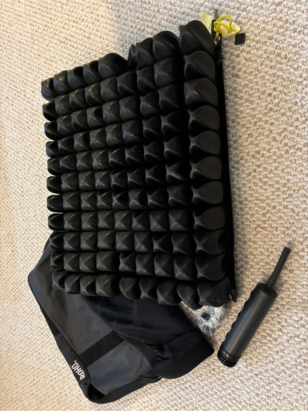 This is a black ROHO cushion. It's designed with multiple air cells for comfort and pressure relief. Includes an air pump for inflation. Ideal for wheelchair users.