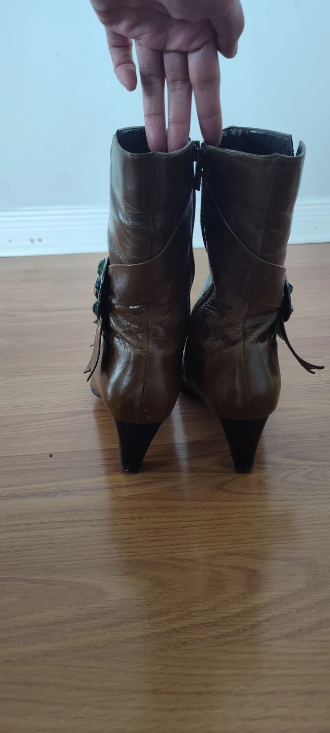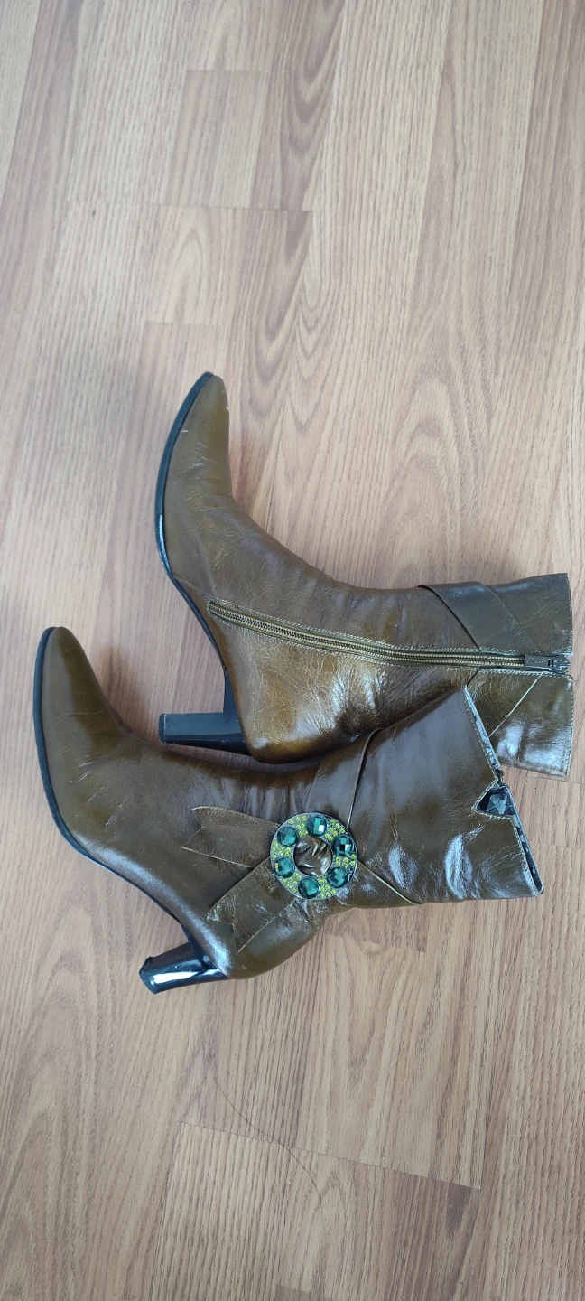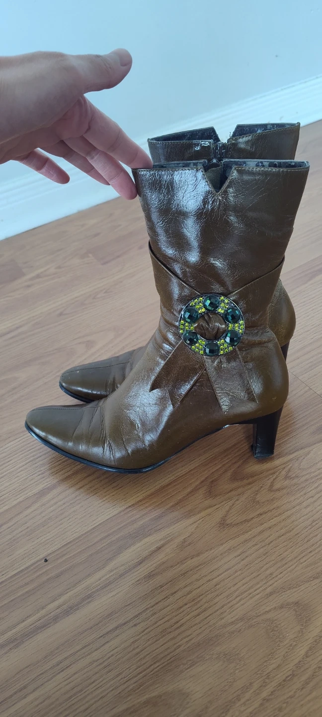 Stylish genuine leather ankle boots with a decorative jewelled buckle. They're ankle height with a side zipper closure and a pointed toe. Heel height is approximately 2 inches. The ankle area is tight, so these are only for thin ankles.