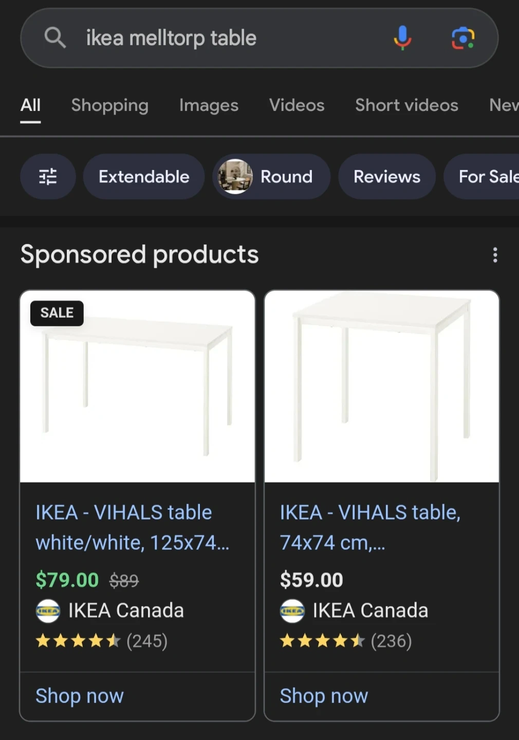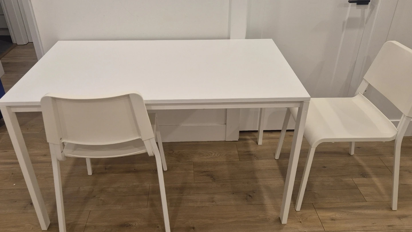 Two white IKEA Teodores chairs and one white IKEA Melltorp table. The table has a white top and white legs. Chairs are sturdy plastic.
