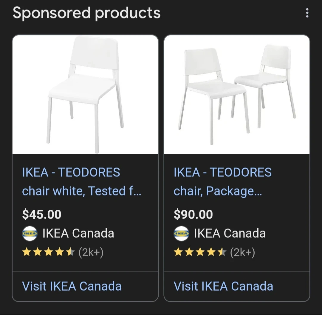 Two white IKEA Teodores chairs and one white IKEA Melltorp table. The table has a white top and white legs. Chairs are sturdy plastic.