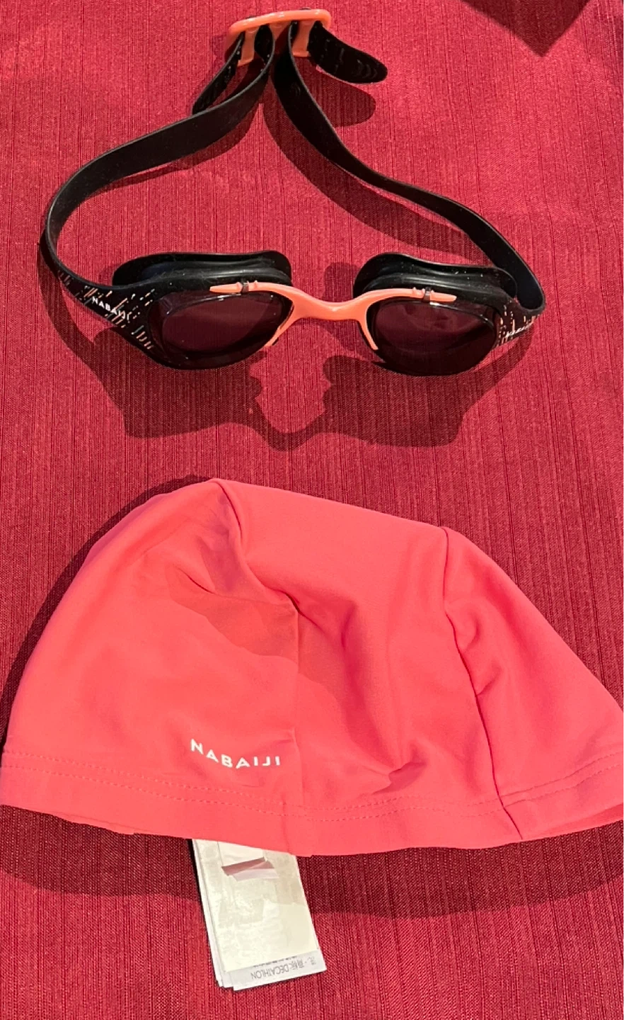 This is a Nabaiji swim set including goggles and a swim cap. The goggles have black straps and clear lenses with orange accents. The swim cap is coral coloured.