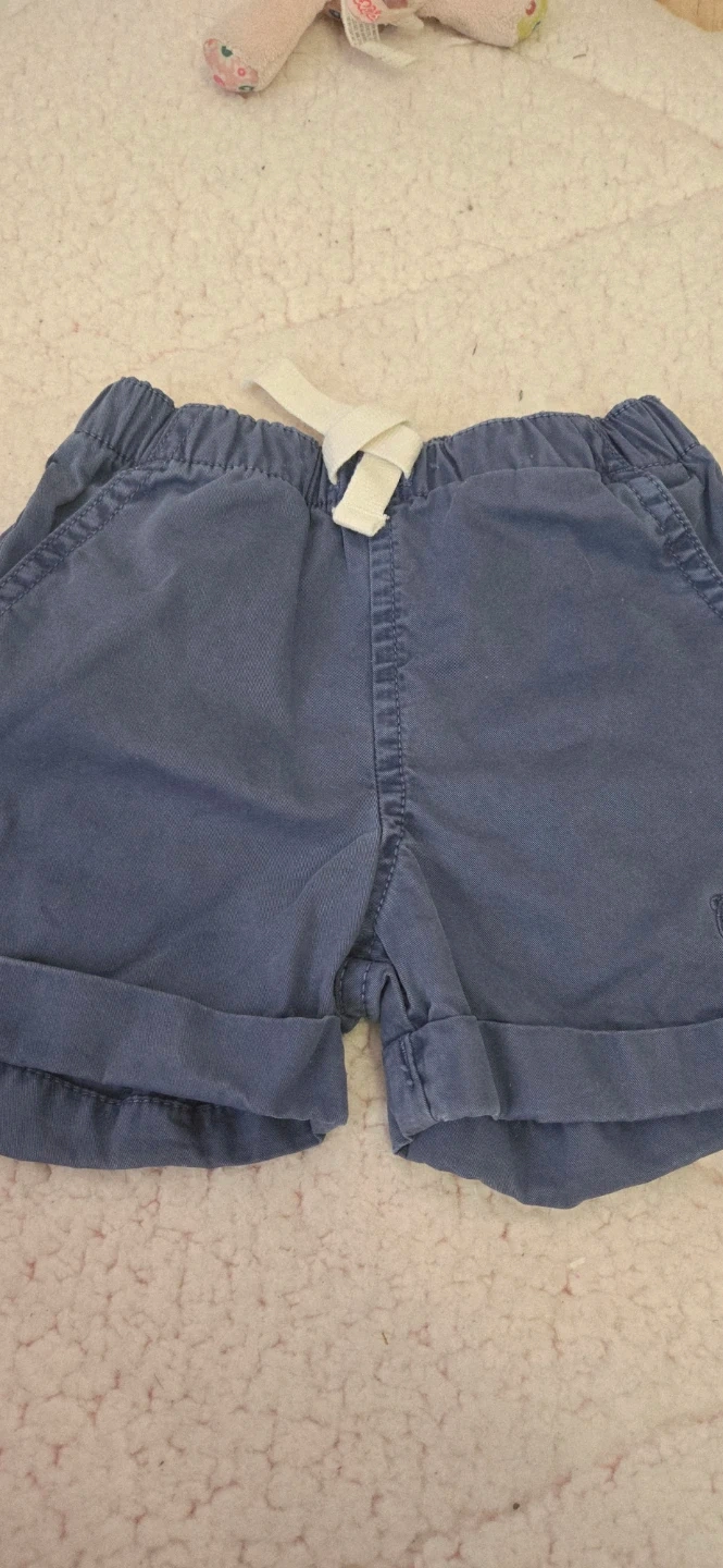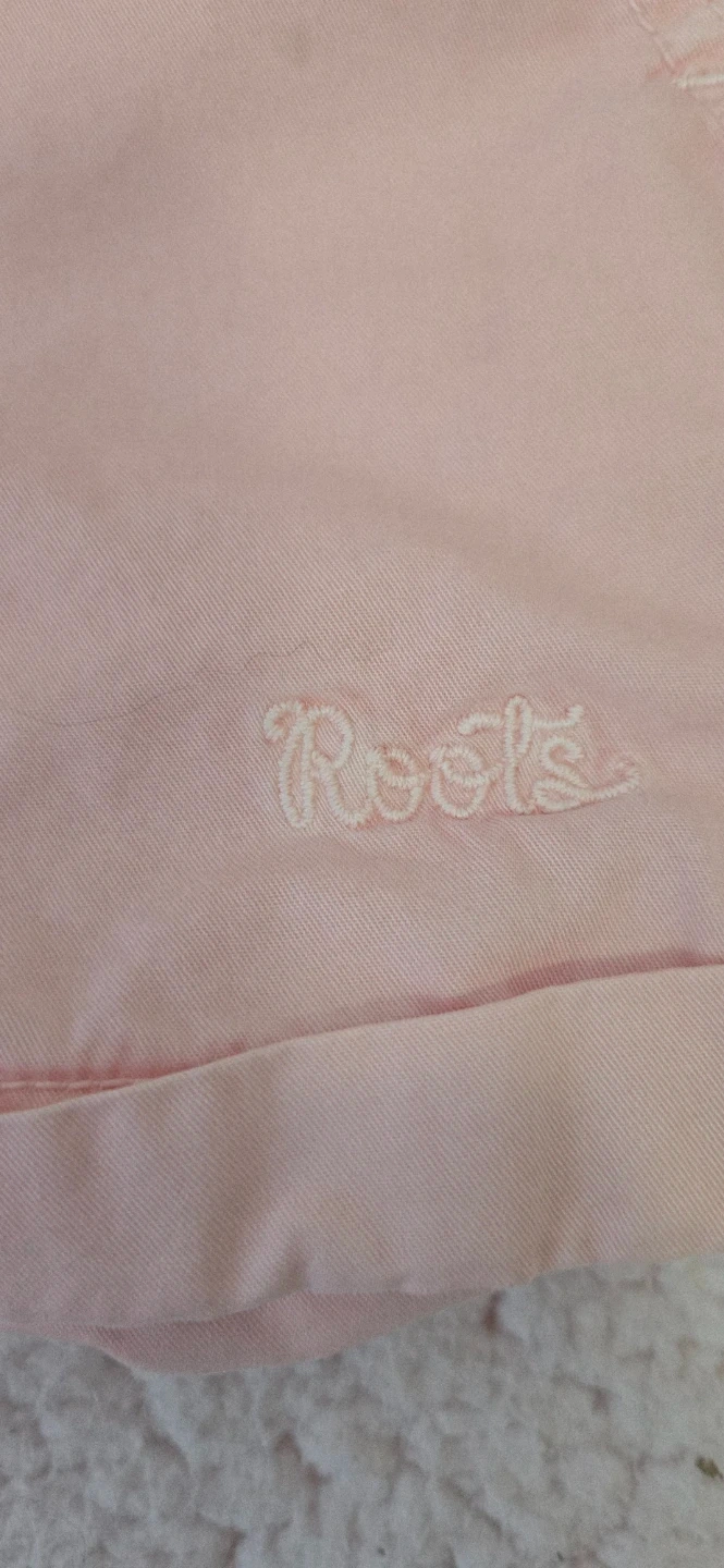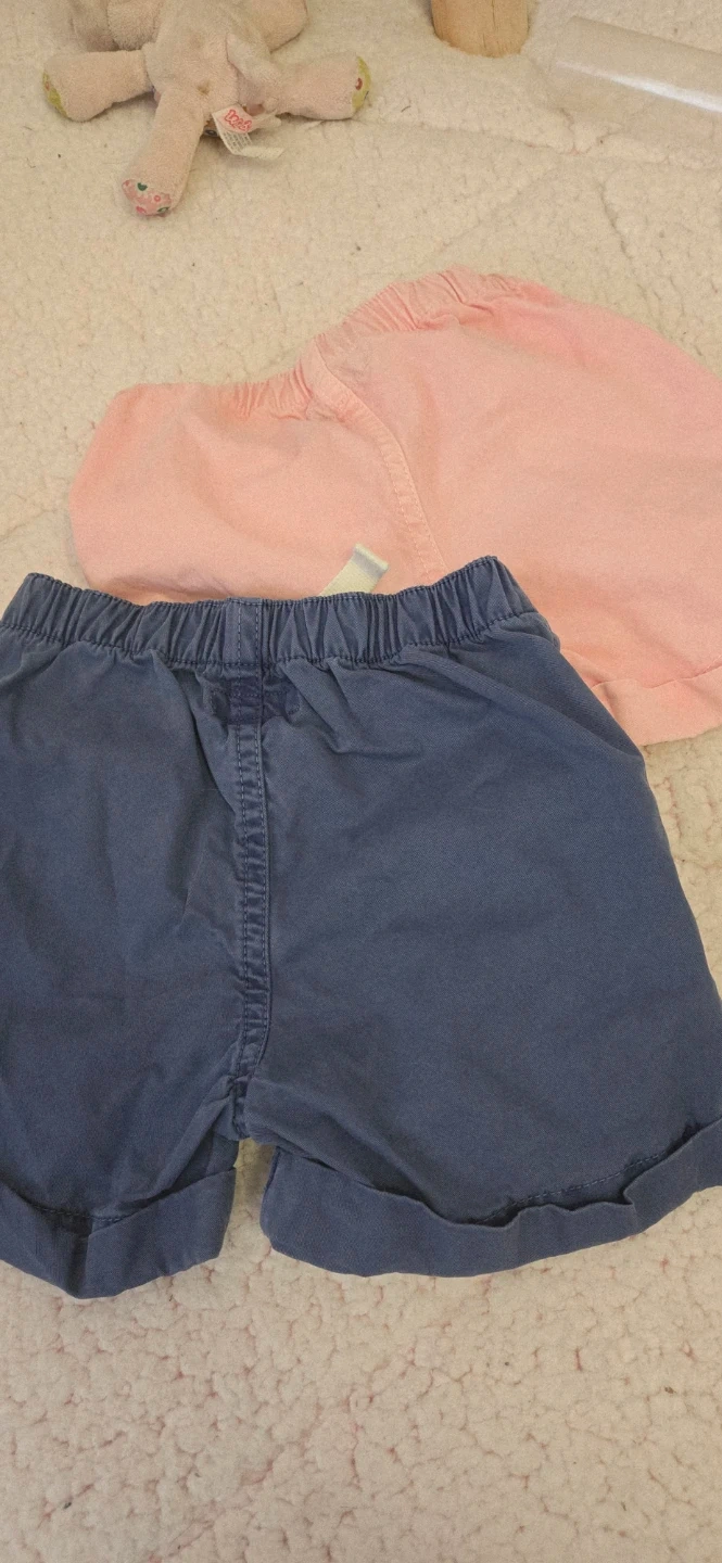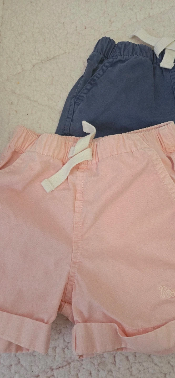 4 ea or both for 6. Two pairs of Baby Roots shorts. One pink pair and one blue pair. Both are 100% cotton. Size medium, which fits 6-12 months.