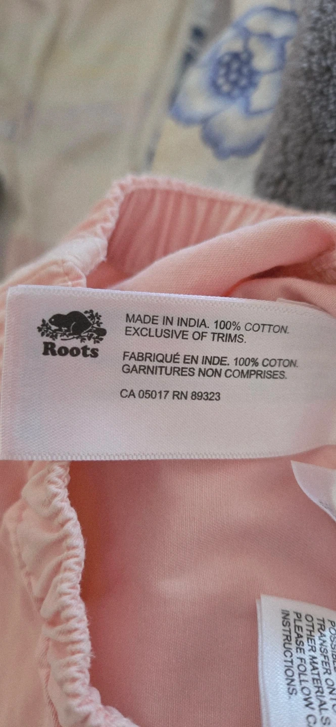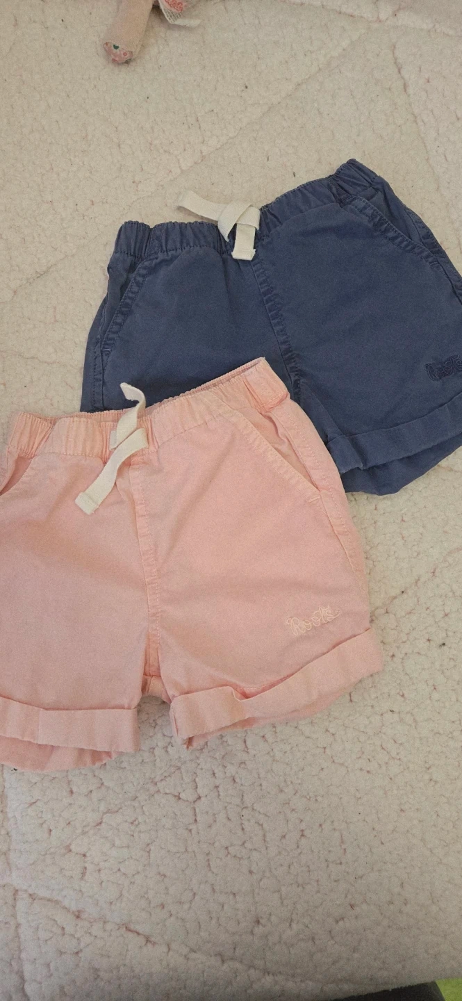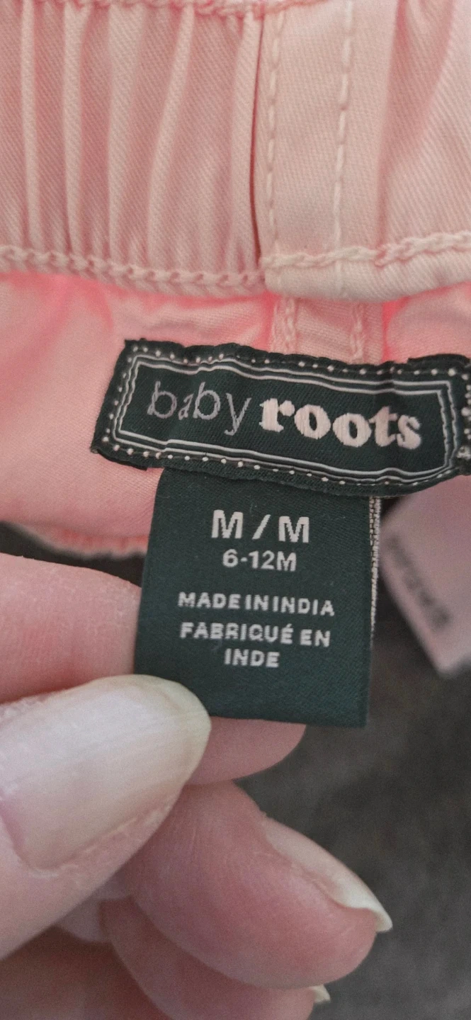 4 ea or both for 6. Two pairs of Baby Roots shorts. One pink pair and one blue pair. Both are 100% cotton. Size medium, which fits 6-12 months.