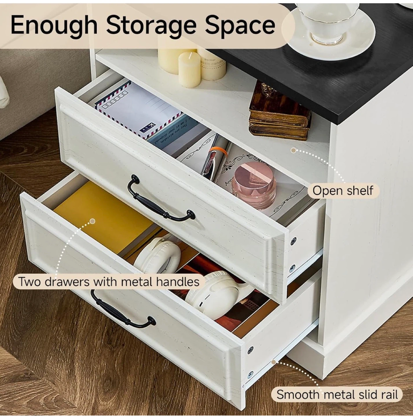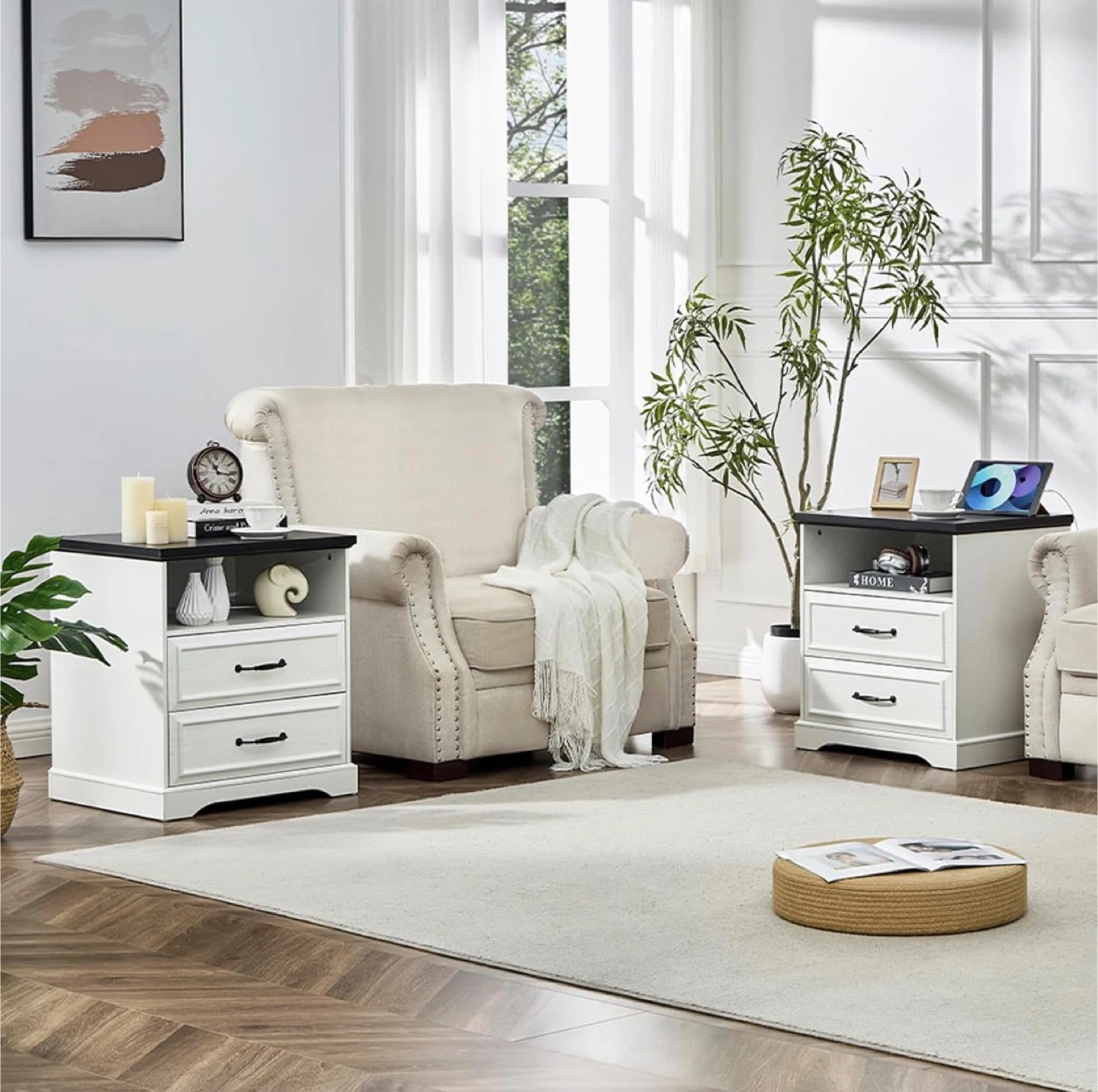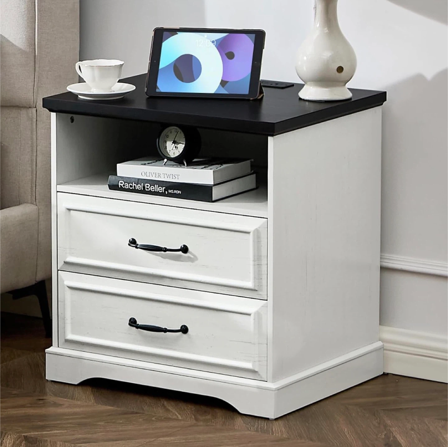 White & Black 2-Drawer Nightstand with Built-in Power Strip