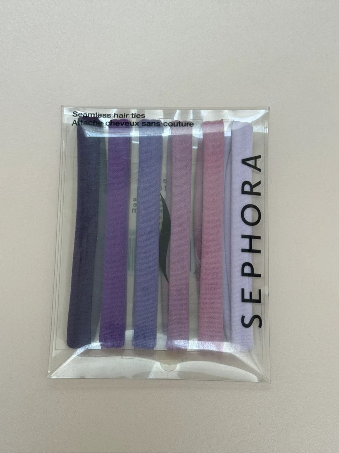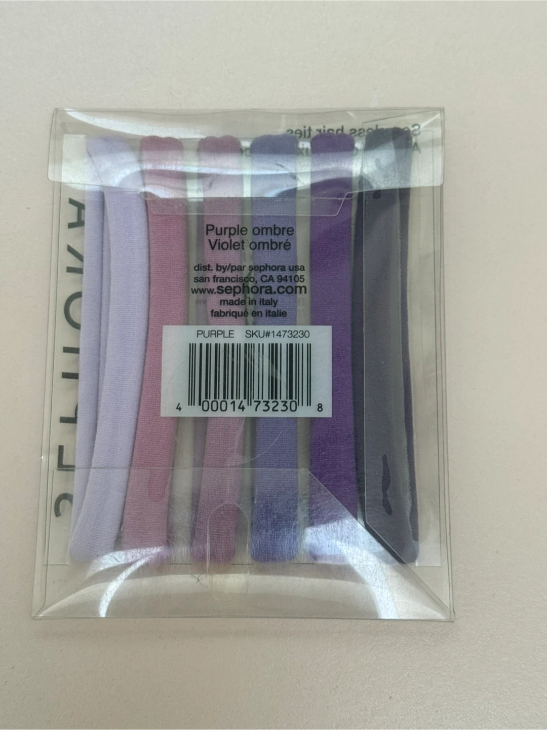 Sephora seamless hair ties in a purple ombre shade. Made in Italy. These hair ties are designed for gentle, snag-free wear. Perfect for various hairstyles throughout the day!