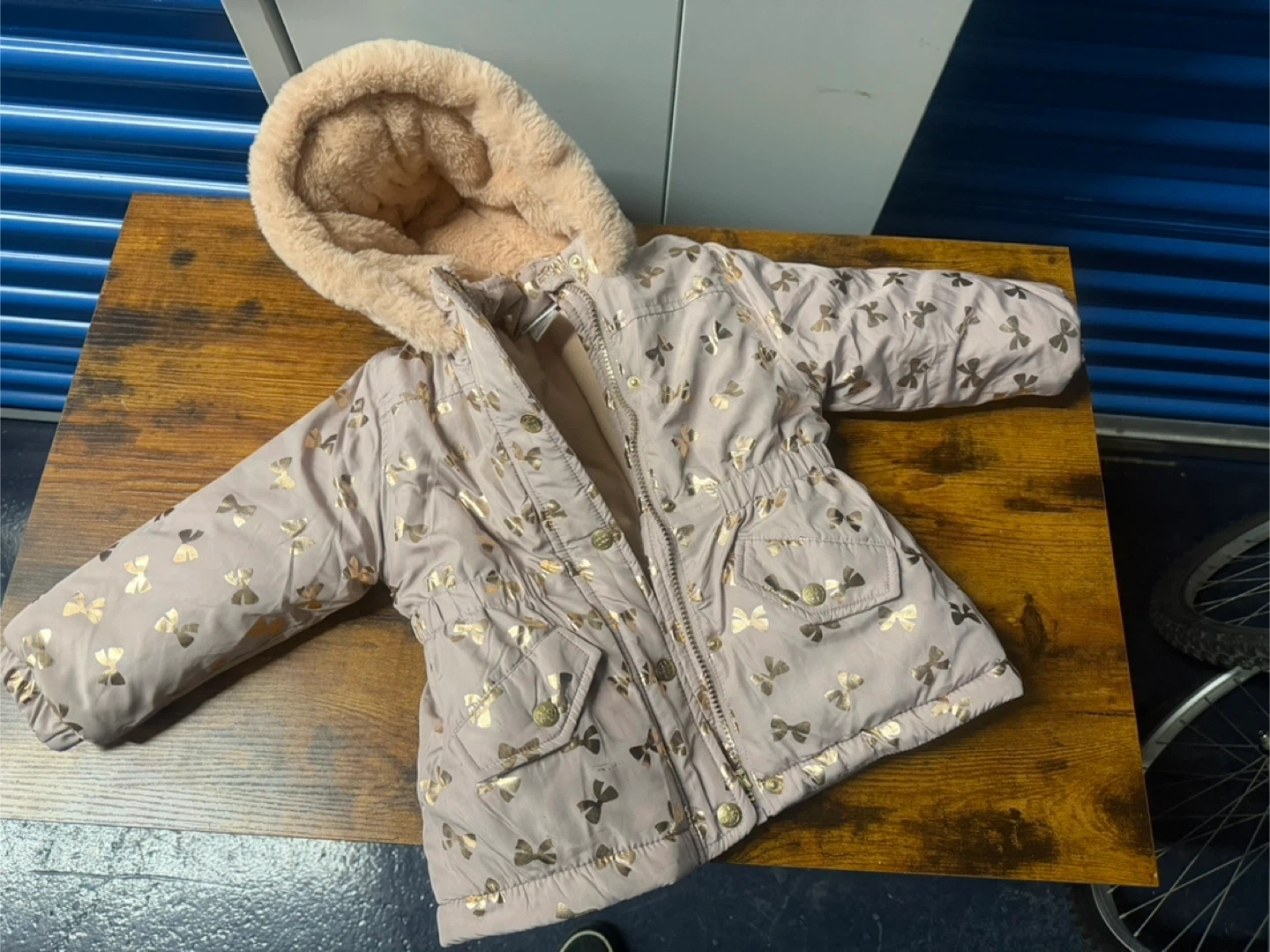 This cozy winter coat features a charming pink base with a repeating gold bow pattern. It has a zip-up front, adjustable waist, and a warm faux fur-lined hood. Perfect for keeping little ones warm and stylish during colder months!