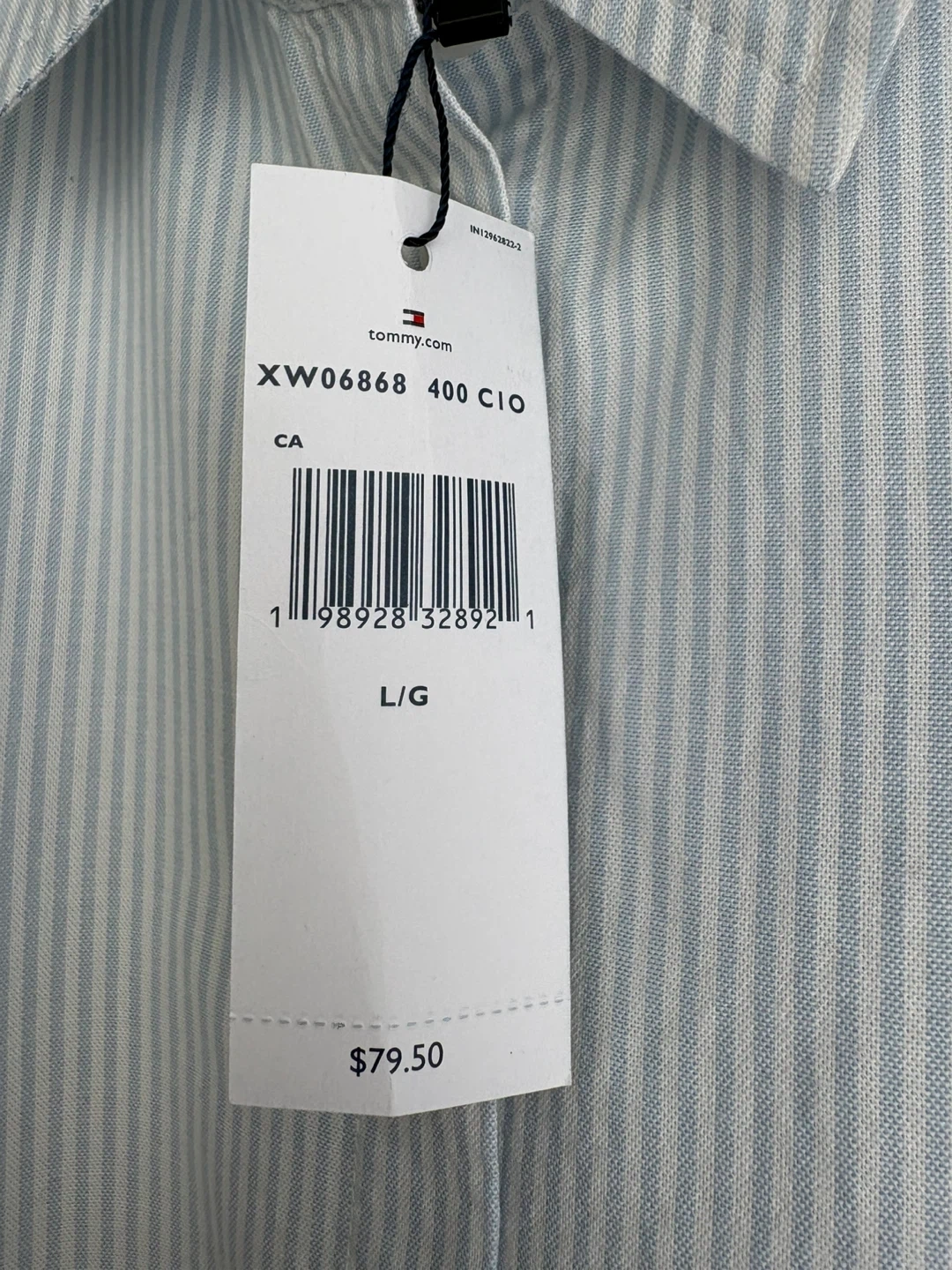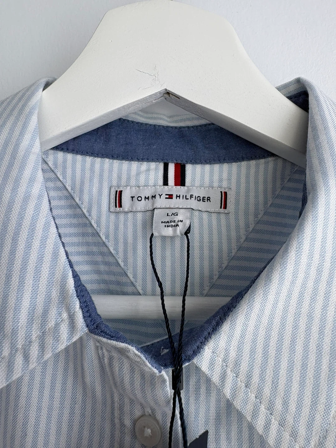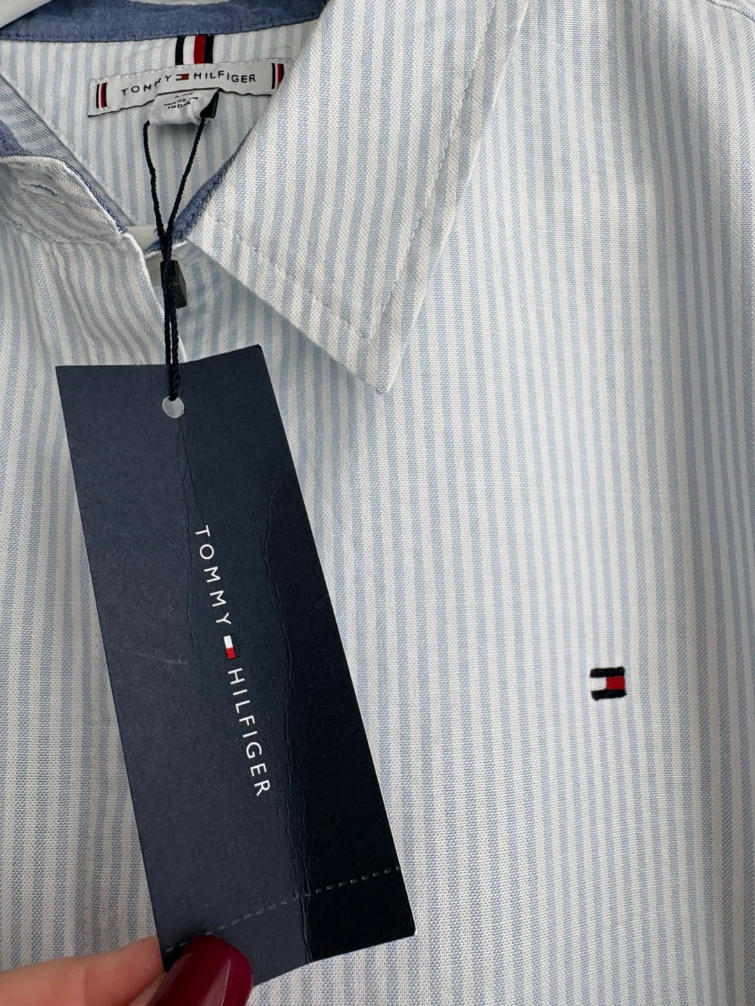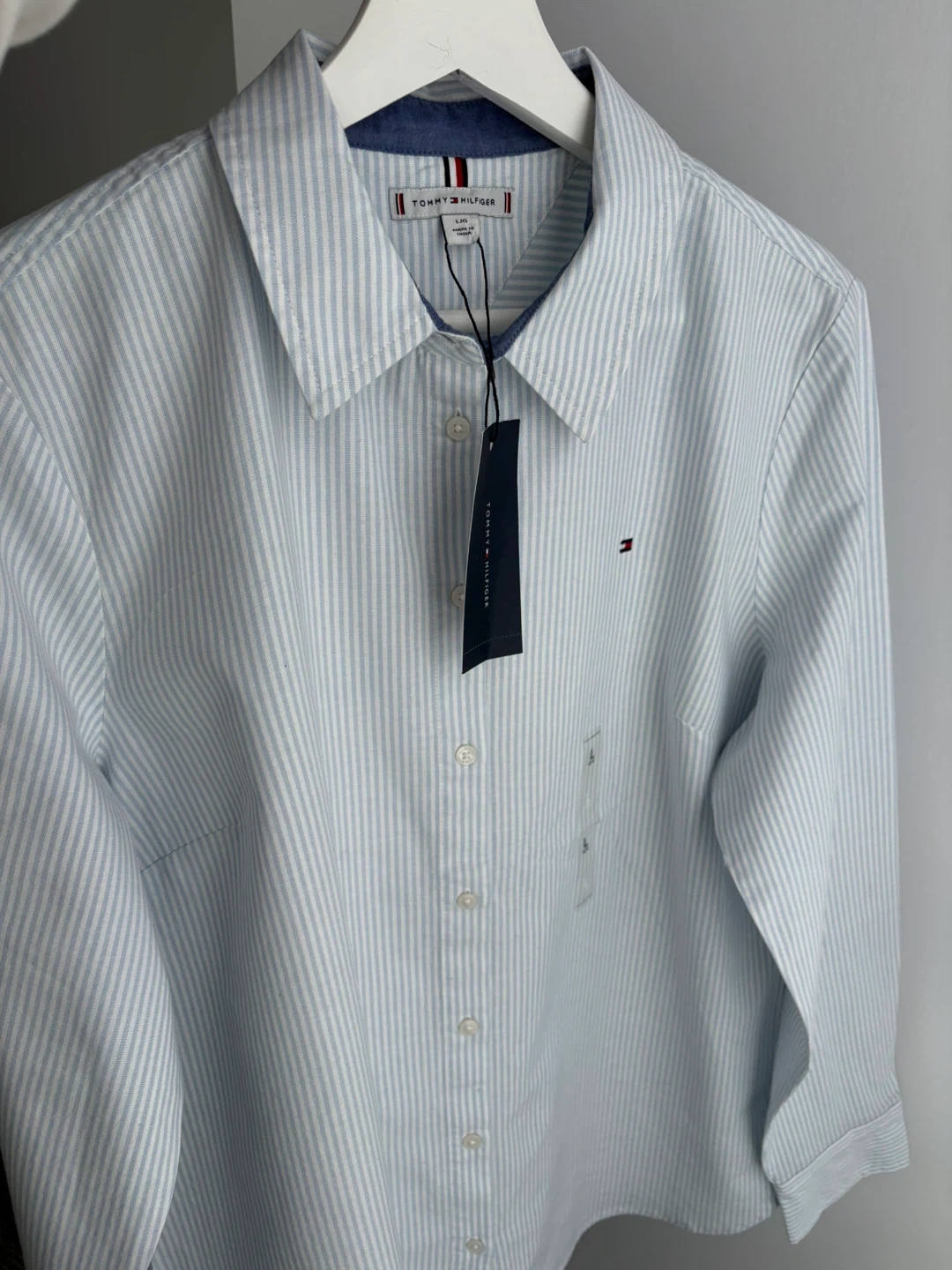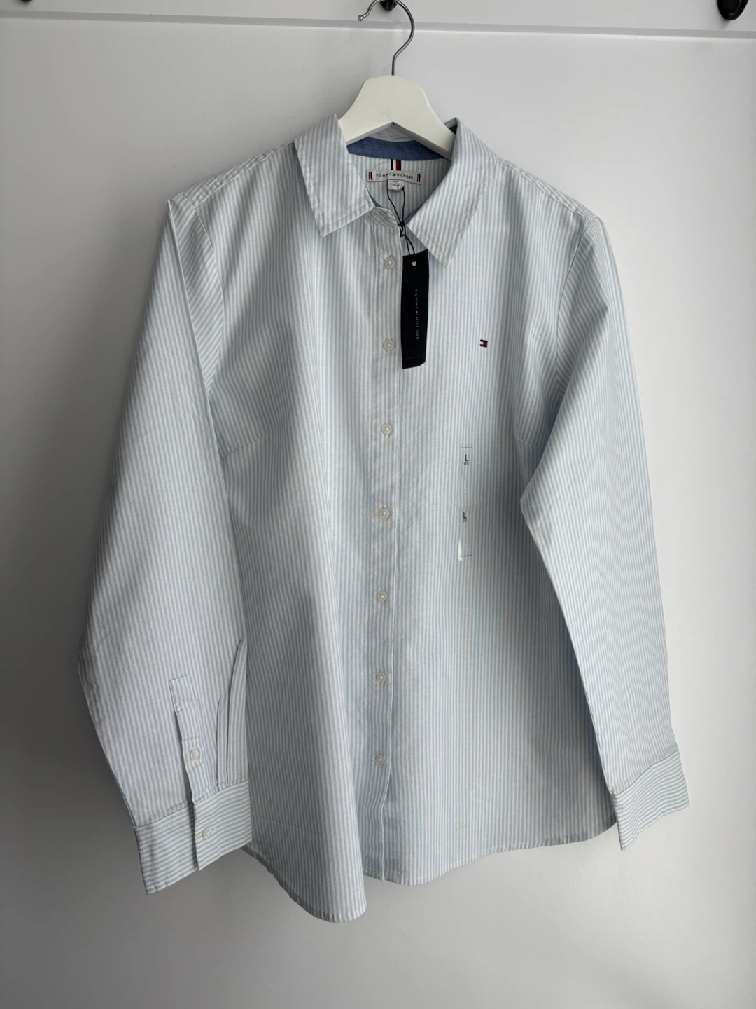 Tommy Hilfiger women's button-up shirt with a light blue and white stripe pattern. Made from 98% cotton and 2% elastane for comfort. This classic fit shirt is size L.