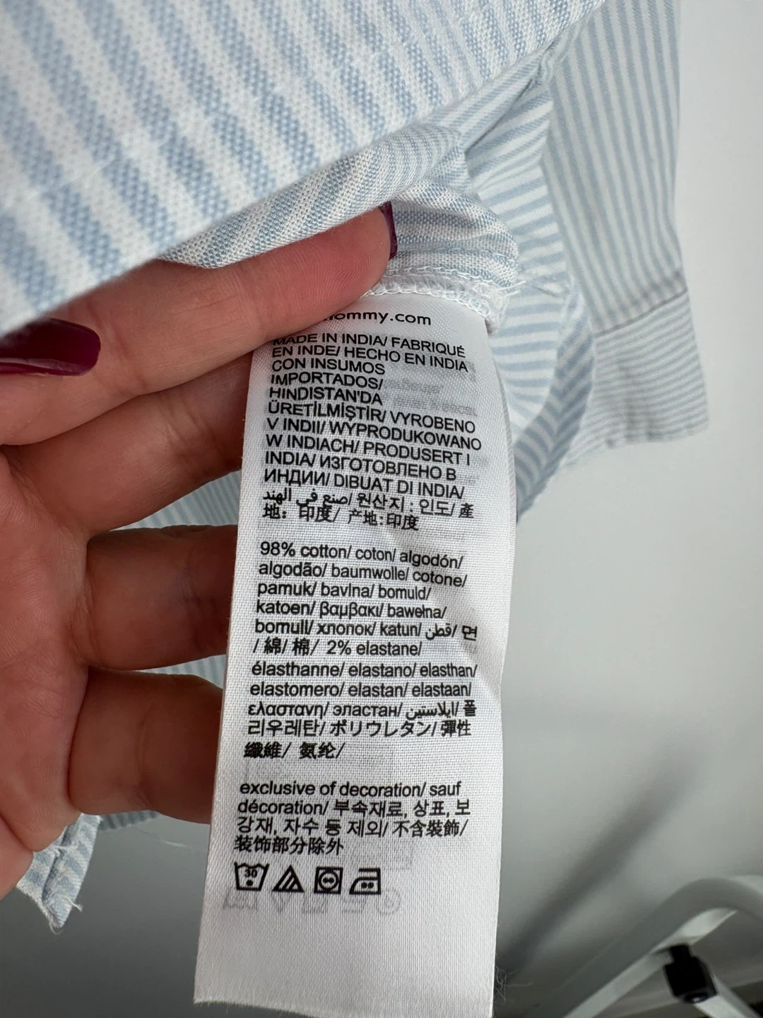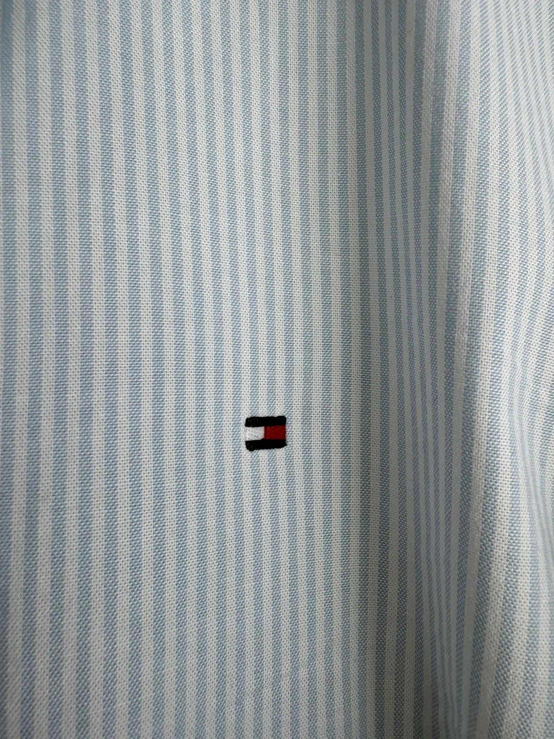 Tommy Hilfiger women's button-up shirt with a light blue and white stripe pattern. Made from 98% cotton and 2% elastane for comfort. This classic fit shirt is size L.