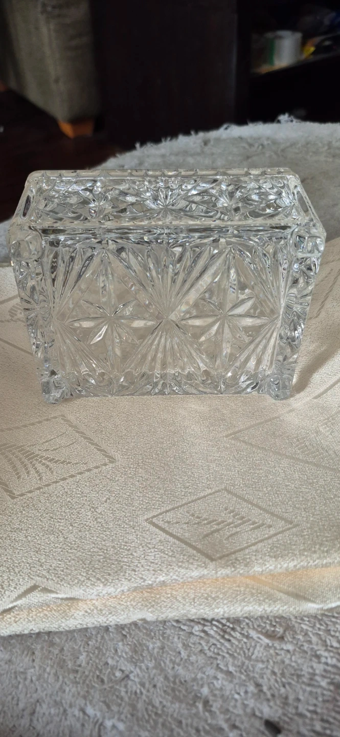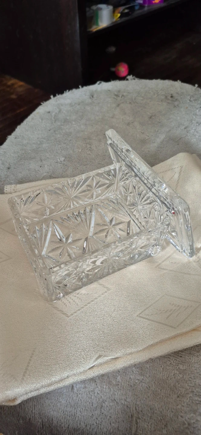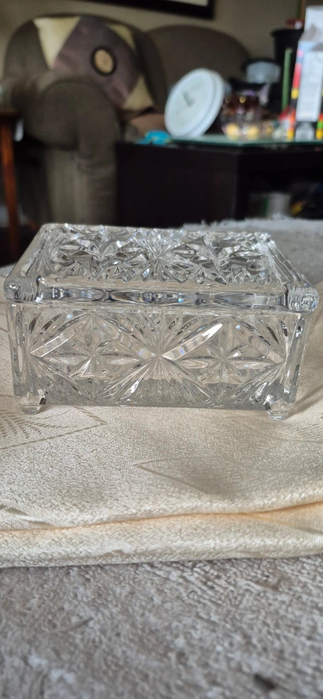 Here's a lovely crystal trinket box with a lid! It's perfect for storing small items or adding a touch of elegance to your space. The box features a beautiful starburst pattern. It's in Mint Condition and ready for a new home.!