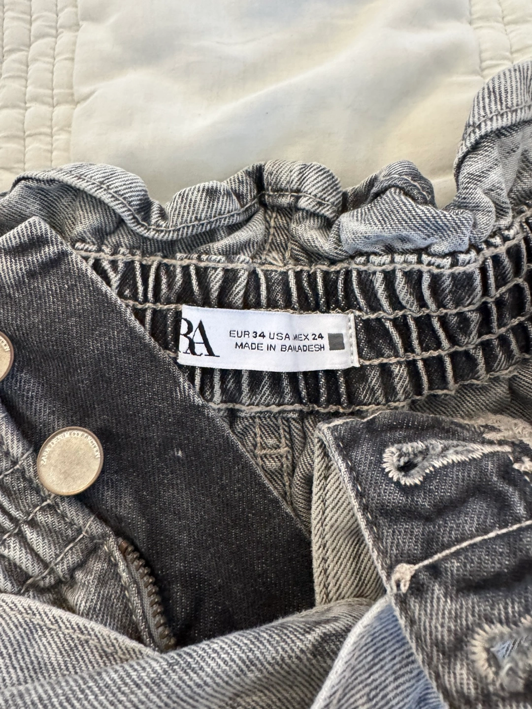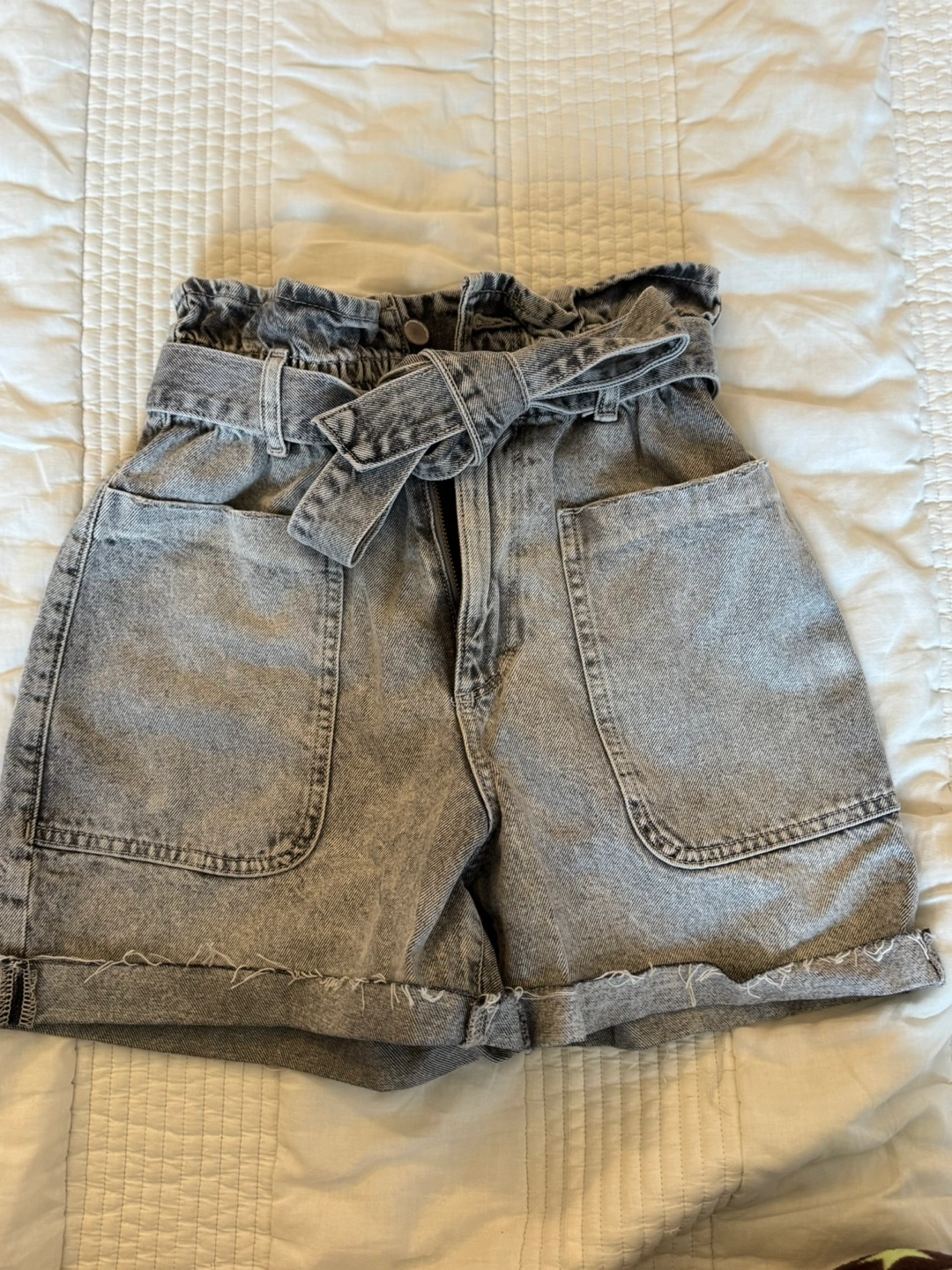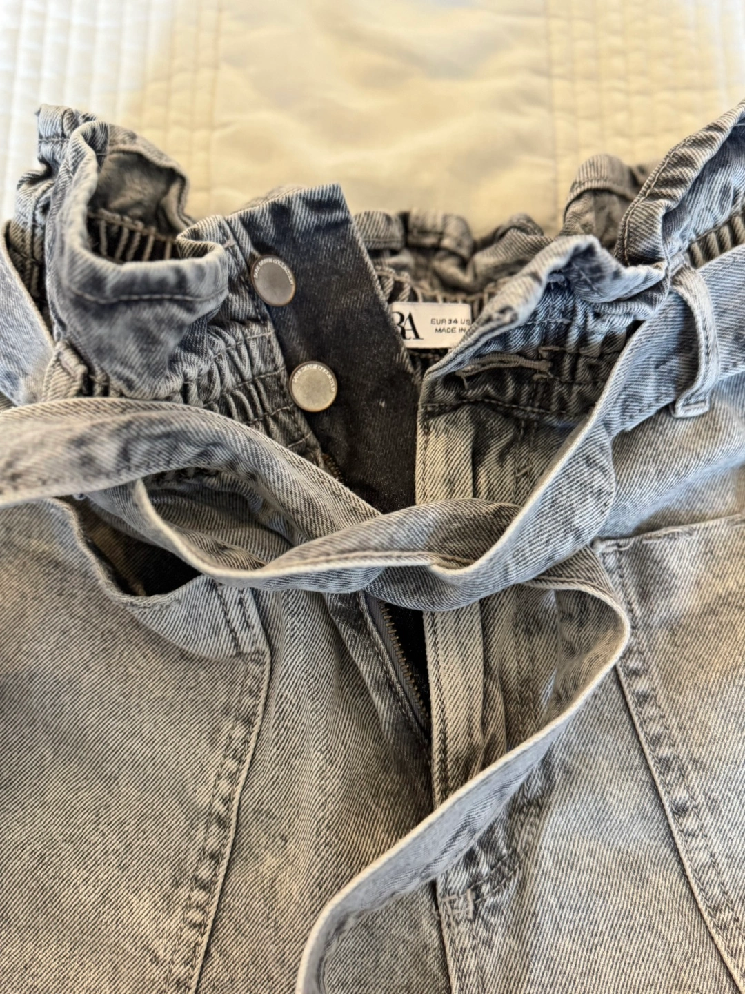 These are a pair of Zara denim shorts with a paperbag waist and belt. They are a size 34.