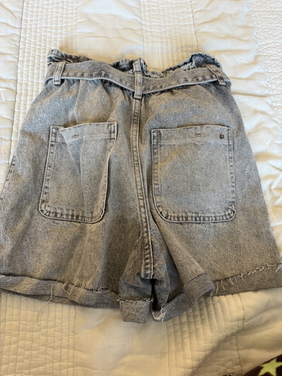 These are a pair of Zara denim shorts with a paperbag waist and belt. They are a size 34.