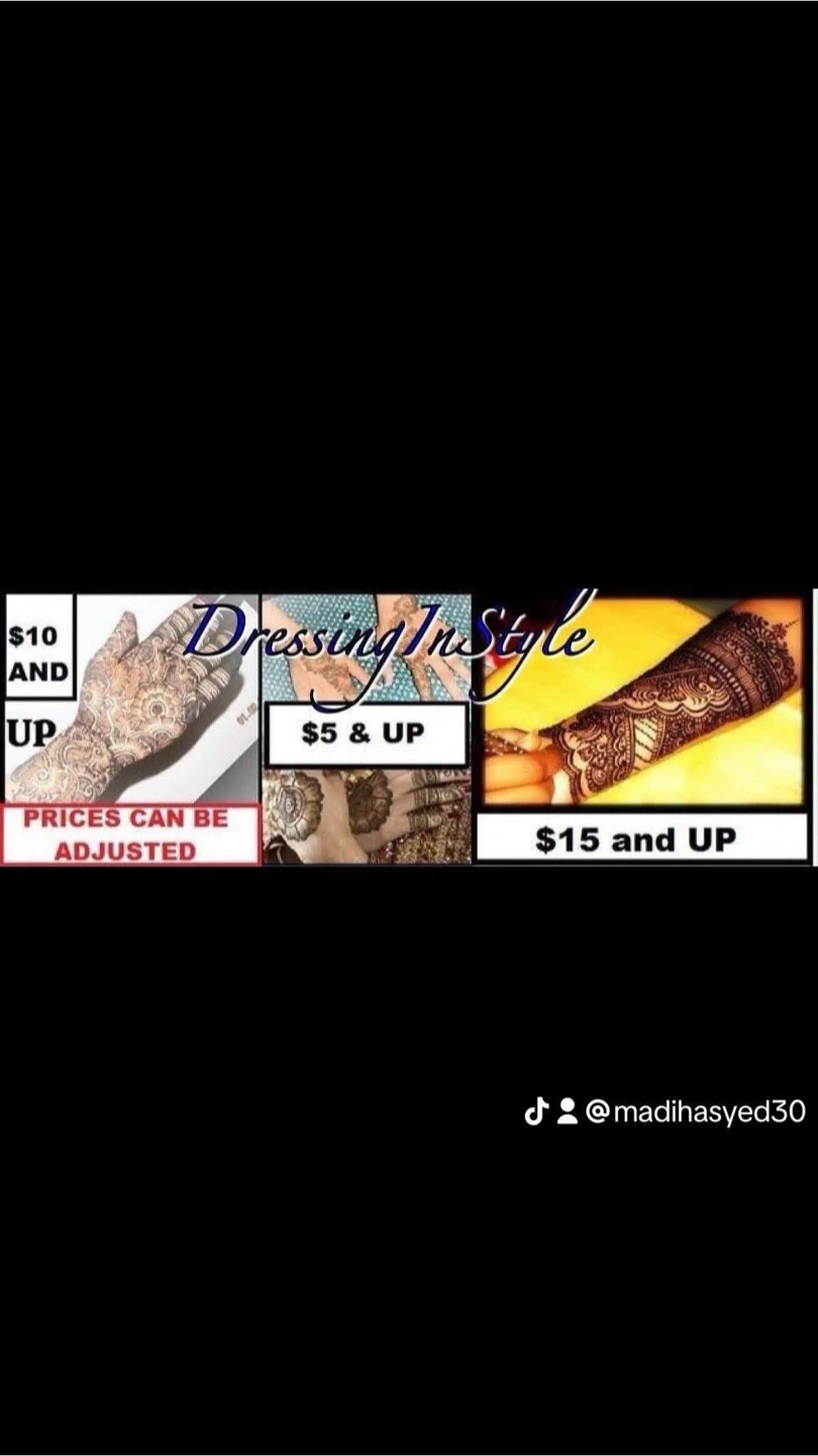 Dressing In Style offers beautiful henna designs for your hands and arms. Prices start at $10 and can be adjusted to suit your needs. Great for special occasions or adding a touch of artistry!