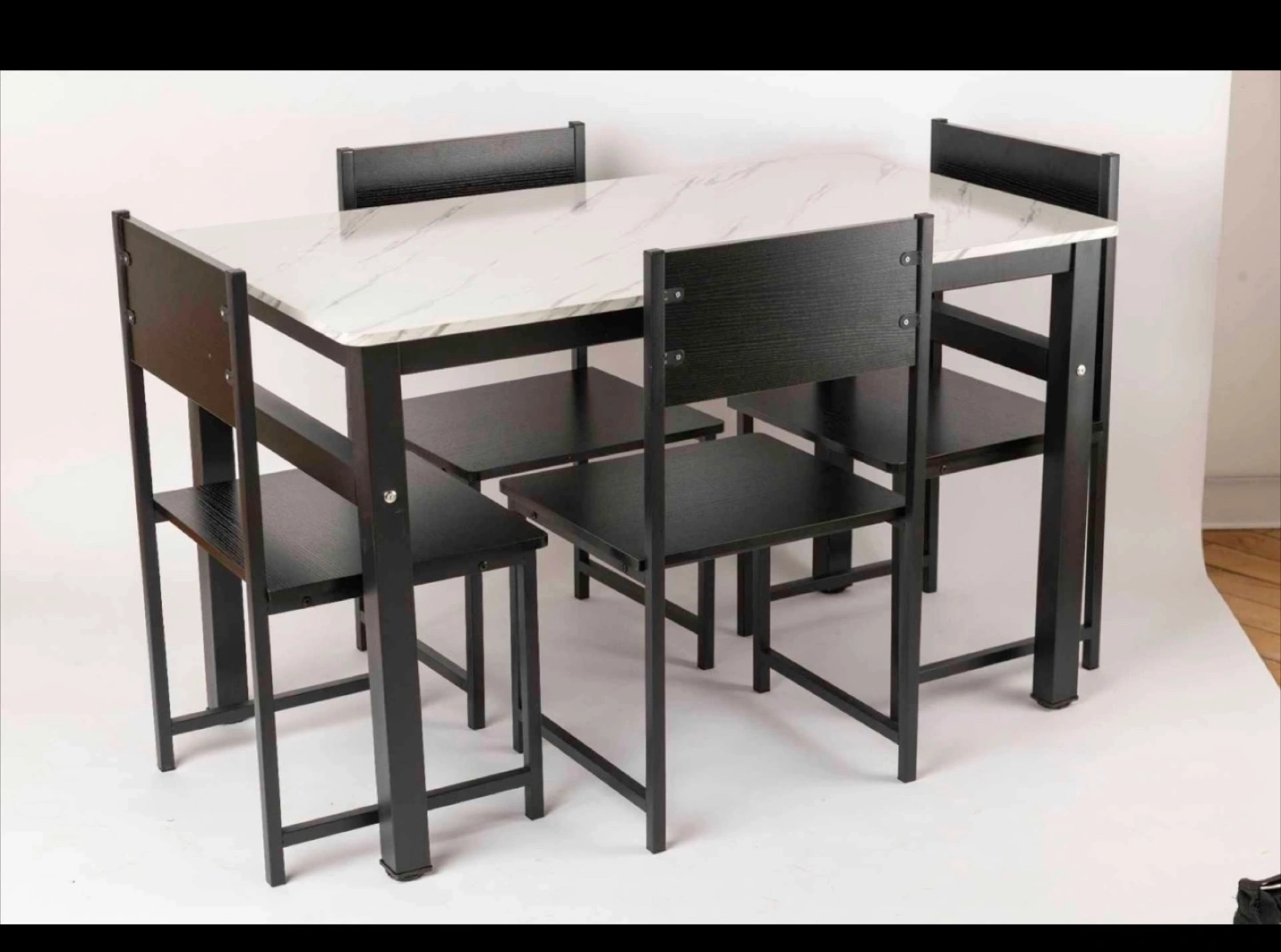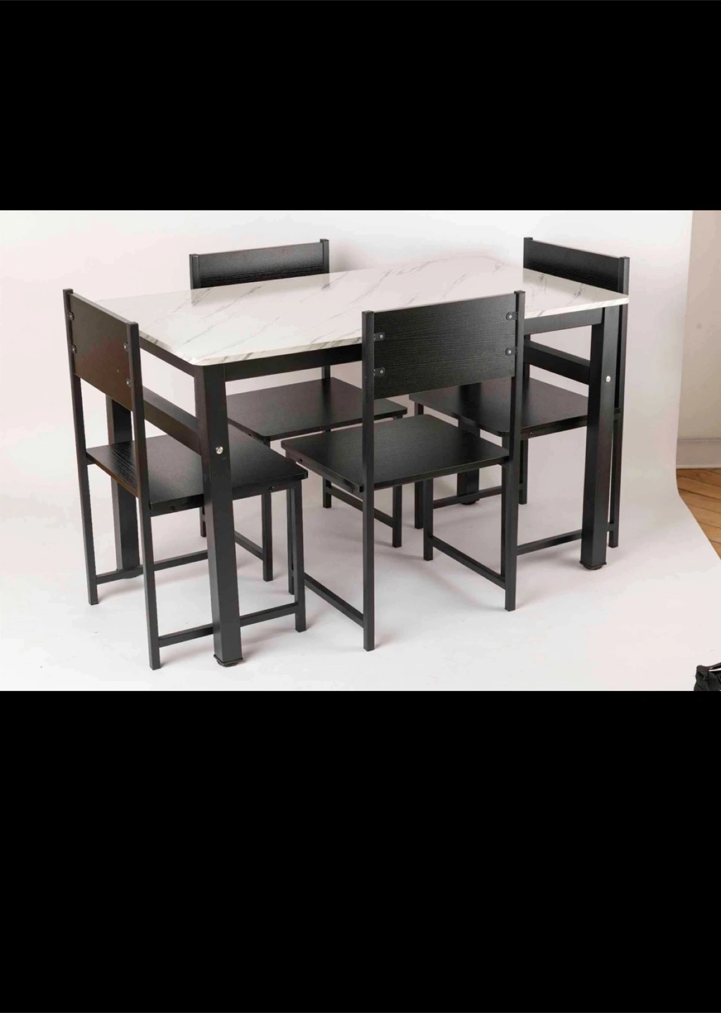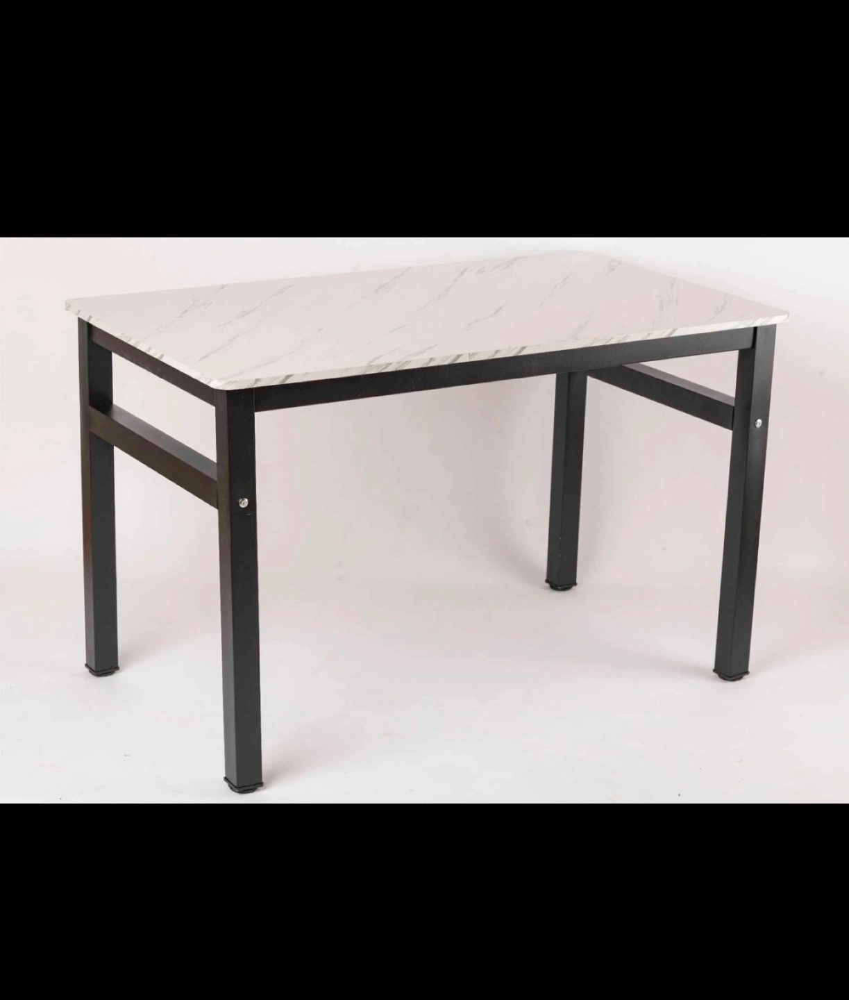 Selling a dining table with a sleek black frame and a bright tabletop. It looks great on its own or with the matching chairs!