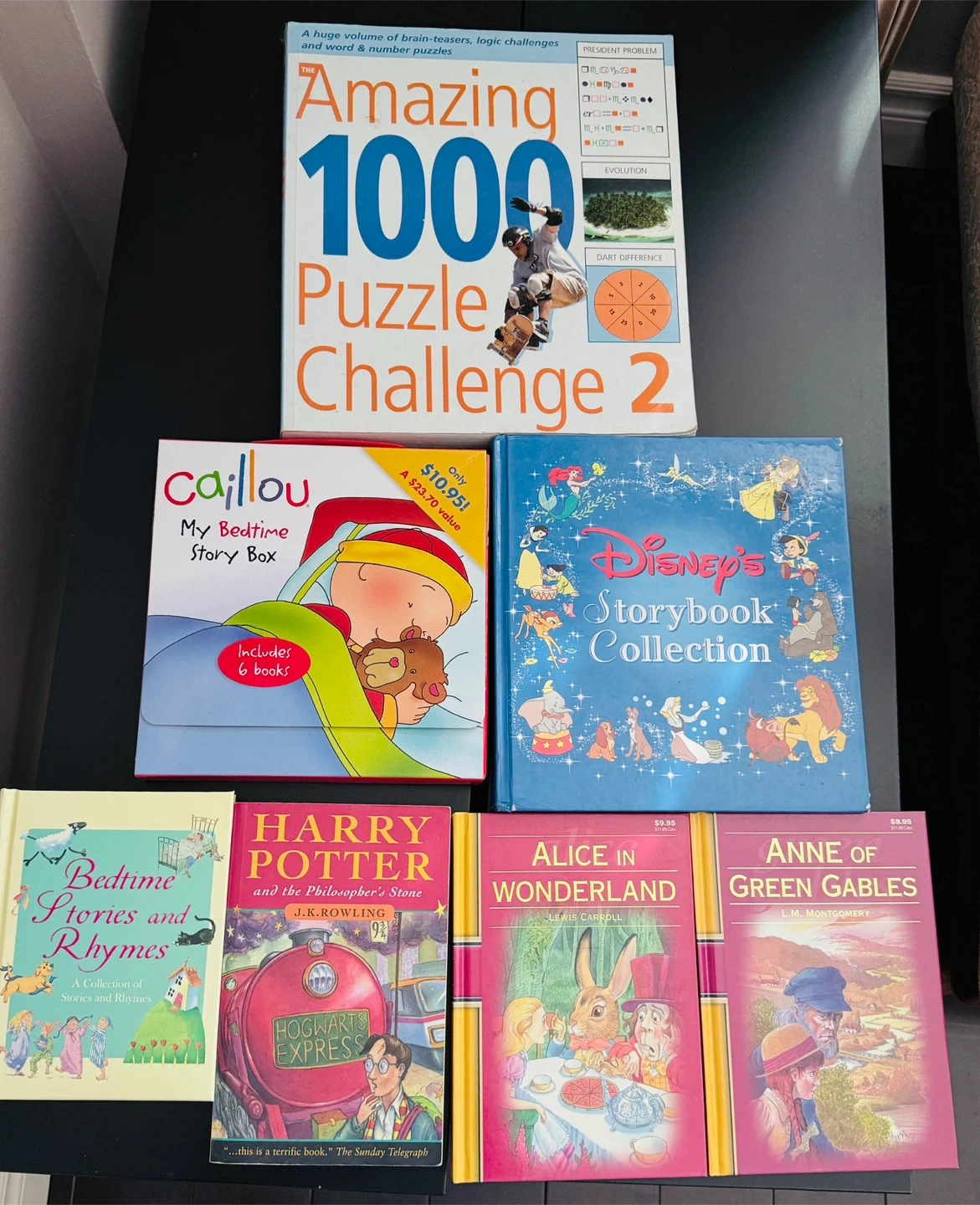 Bundle of children's books including 'The Amazing 1000 Puzzle Challenge 2', 'Caillou's My Bedtime Story Box' with 6 books, 'Disney's Storybook Collection', 'Bedtime Stories and Rhymes', 'Harry Potter and the Philosopher's Stone', 'Alice in Wonderland', and 'Anne of Green Gables'. Great for young readers!