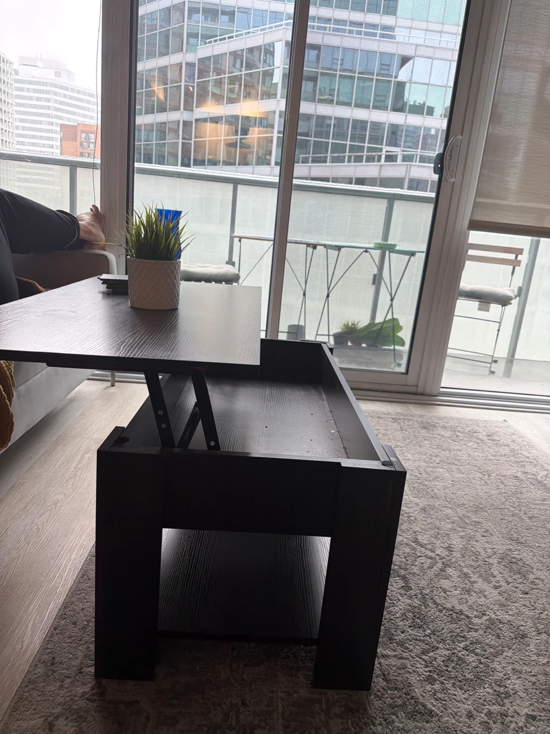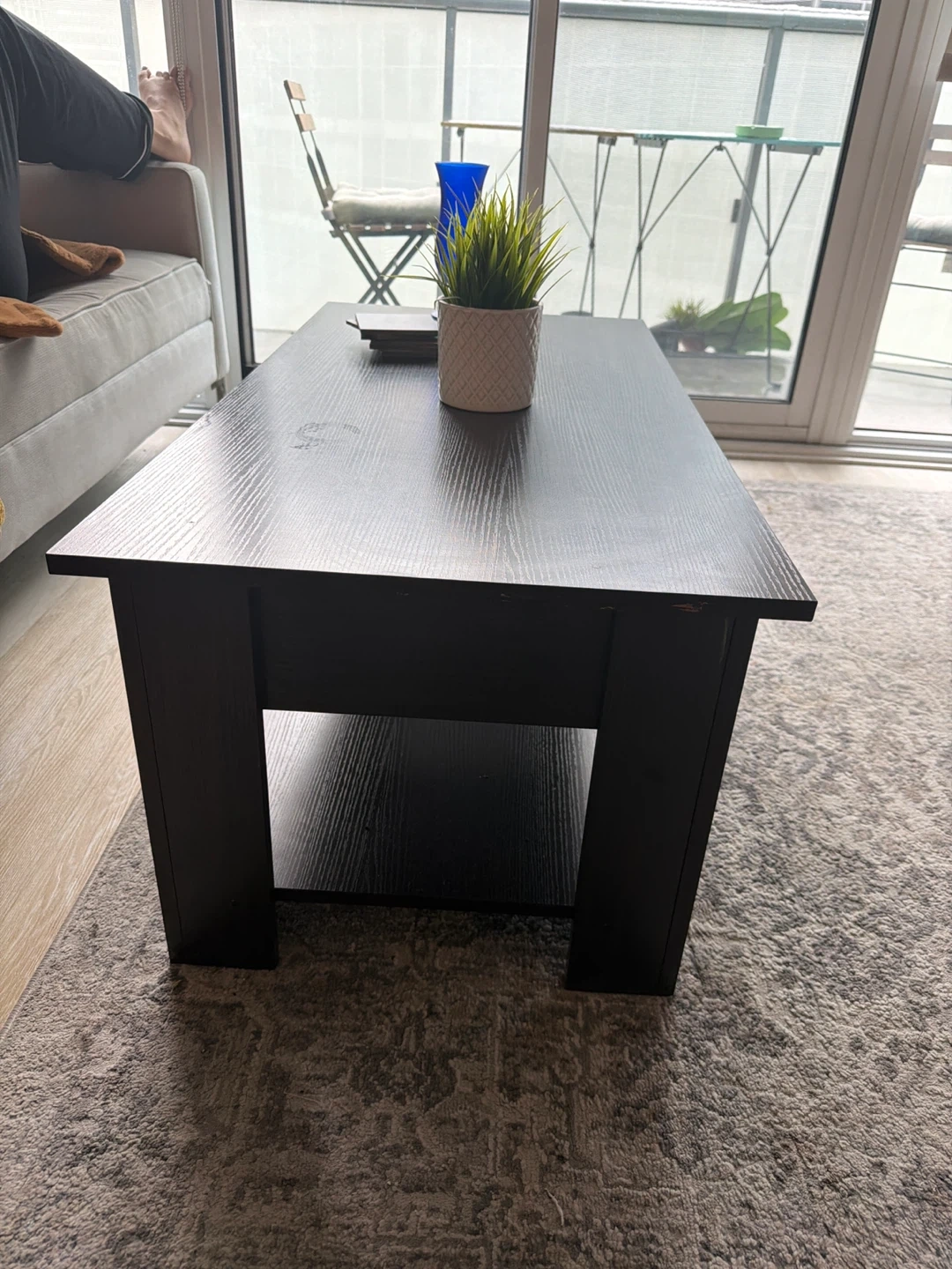 Dark wood coffee table with a lift-top feature for extra workspace or storage. It has a lower shelf for additional display or storage. This table offers a versatile solution for small spaces.