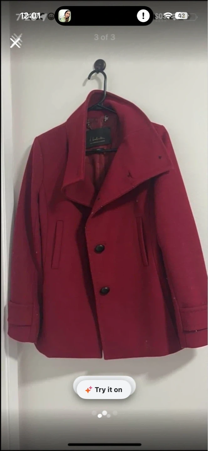 A stylish red pea coat, perfect for cooler weather. Made with a wool blend for warmth and durability. Classic double-breasted style with button closure. Size xsmall pick up cash only